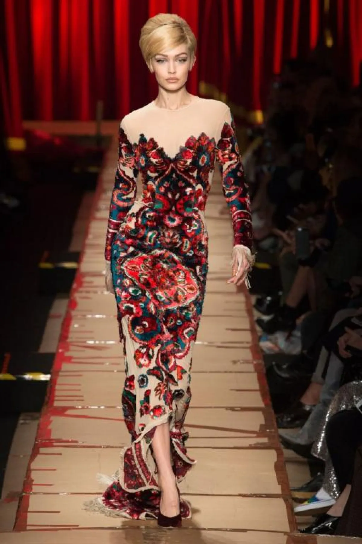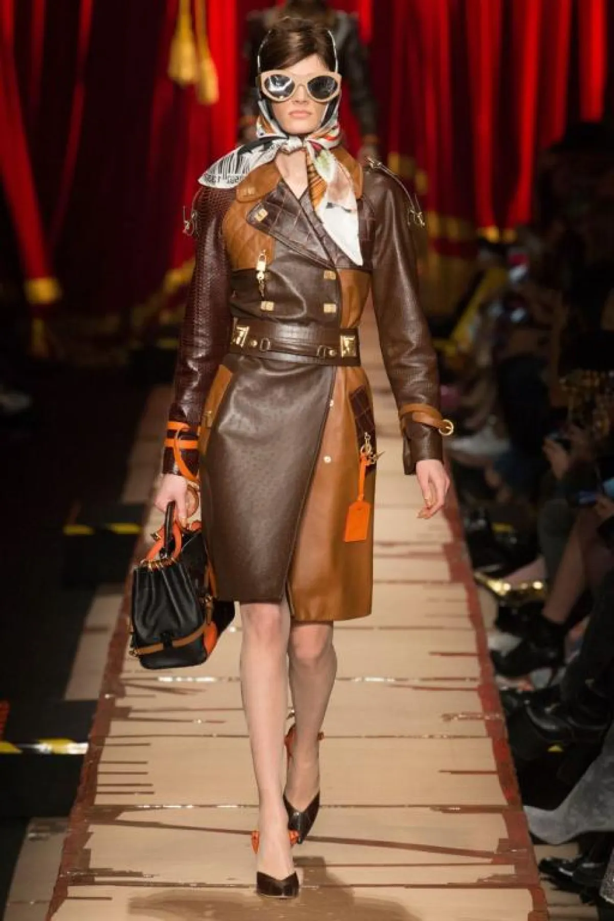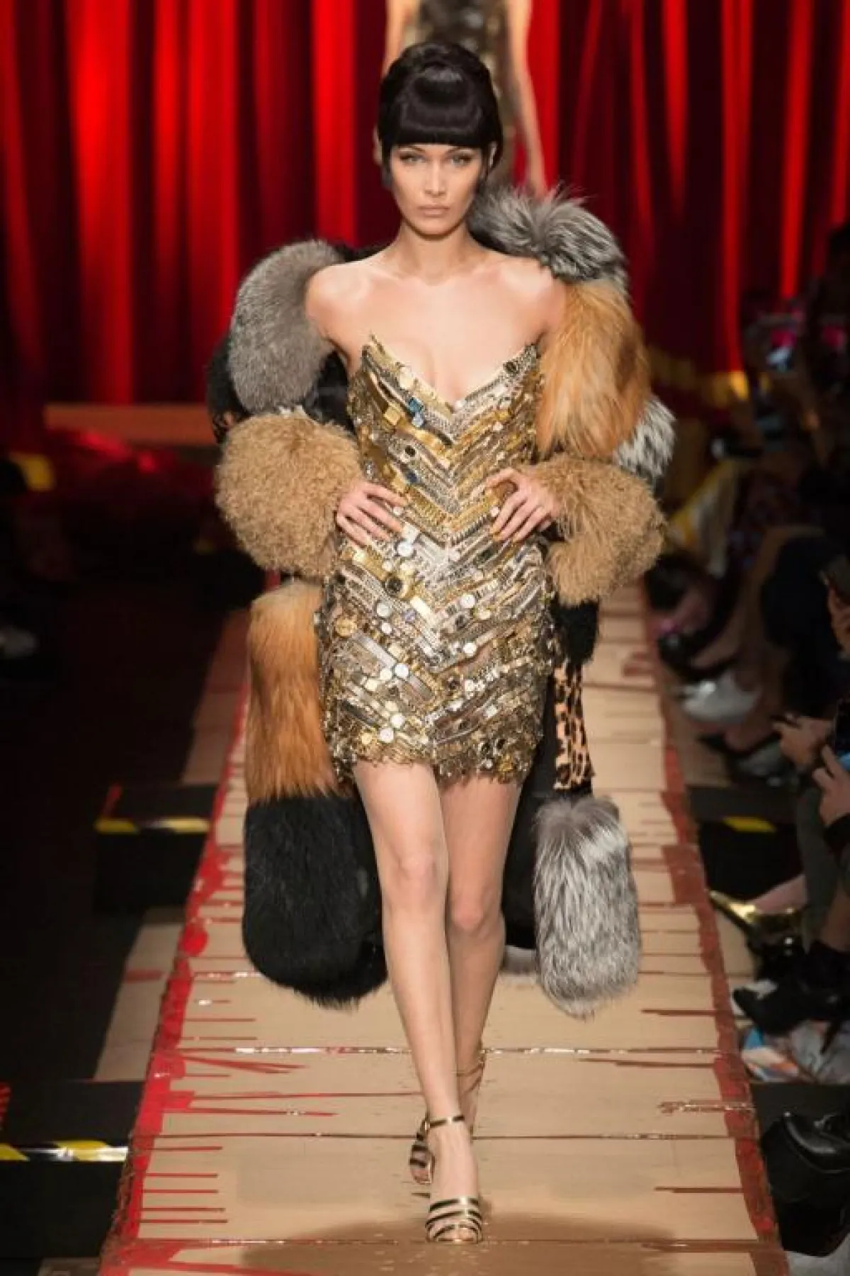 مجموعة دار "موسكينو" Moschino بدت مرحة كالعادة غنية بالأفكار الشبابية المستوحاة من الواقع اليومي التي يقدمها دائماً المدير الابداعي للدار "جيرمي سكوت" Jeremy Scott وبشكل أساسي استوحى المجموعة هذه المرة من الطورد البريدية ومن الصناديق الكرتوينة التي تحمل هذه الطرود، كما من المجلات في التسعينات من خلال الطبعات التي زينت الأزياء، ولم تخلو المجموعة من الجانب المترف في بعض تصاميم الفساتين ولاسيما الفستان الذي ارتدته "بيلا حديد" Bella Hadid المزين بساعات ذهبية على طوله.