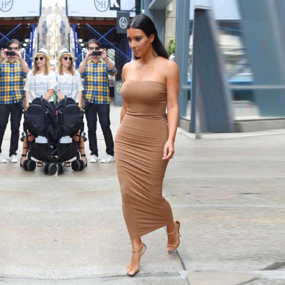 كيم كارداشيان بفستان باللون البيج يزيدها طولاً.
