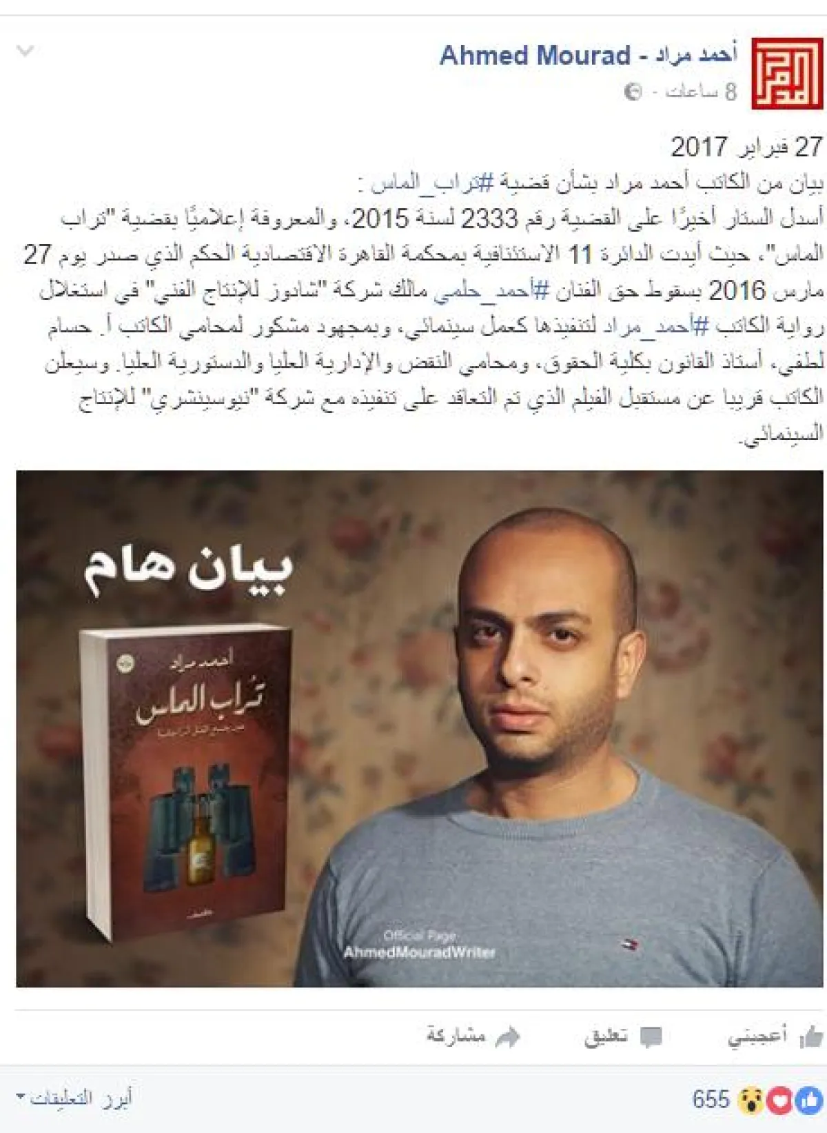 الكاتب أحمد مراد رفض كل محاولات التفاوض مع حلمي، وأصر على فسخ التعاقد مؤكداً أنه سيكتب بنفسه سيناريو الفيلم المقتبس عن الرواية الشهيرة وتردد أنه رشح الفنان آسر ياسين لبطولة الفيلم المنتظر والاخراج لمروان حامد، وبعد اللجوء للقضاء، أصدر مراد بياناً رسمياً مساء أمس جاء فيه: "أسدل الستار أخيراً على القضية رقم 2333 لسنة 2015، والمعروفة إعلامياً بقضية "تراب الماس"، حيث أيدت الدائرة 11 الاستئنافية بمحكمة القاهرة الاقتصادية الحكم الذي صدر يوم 27 مارس 2016 بسقوط حق الفنان أحمد حلمي مالك شركة "شادوز للإنتاج الفني" في استغلال رواية الكاتب أحمد مراد لتنفيذها كعمل سينمائي، وبمجهود مشكور لمحامي الكاتب أ. حسام لطفي، أستاذ القانون بكلية الحقوق، ومحامي النقض والإدارية العليا والدستورية العليا. وسيعلن الكاتب قريباً عن مستقبل الفيلم الذي تم التعاقد على تنفيذه مع شركة "نيوسينشري" للإنتاج السينمائي".