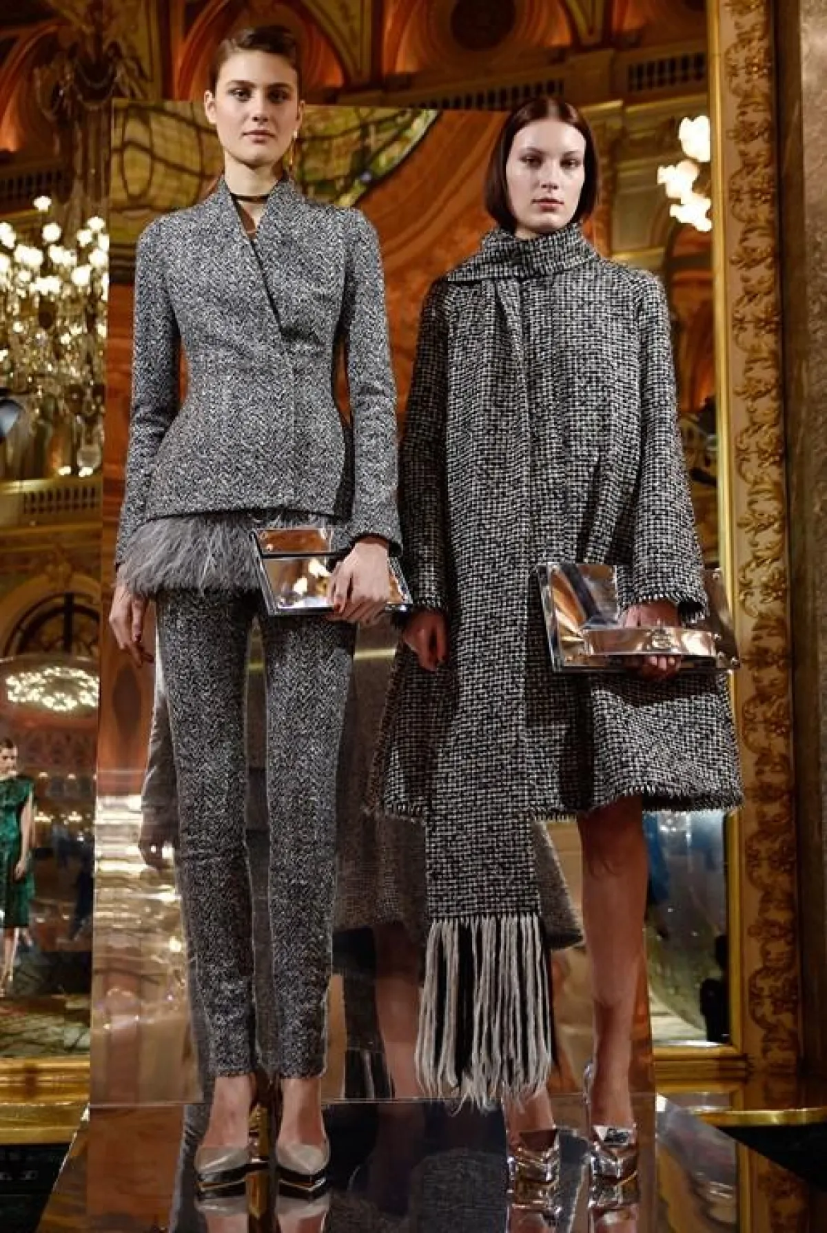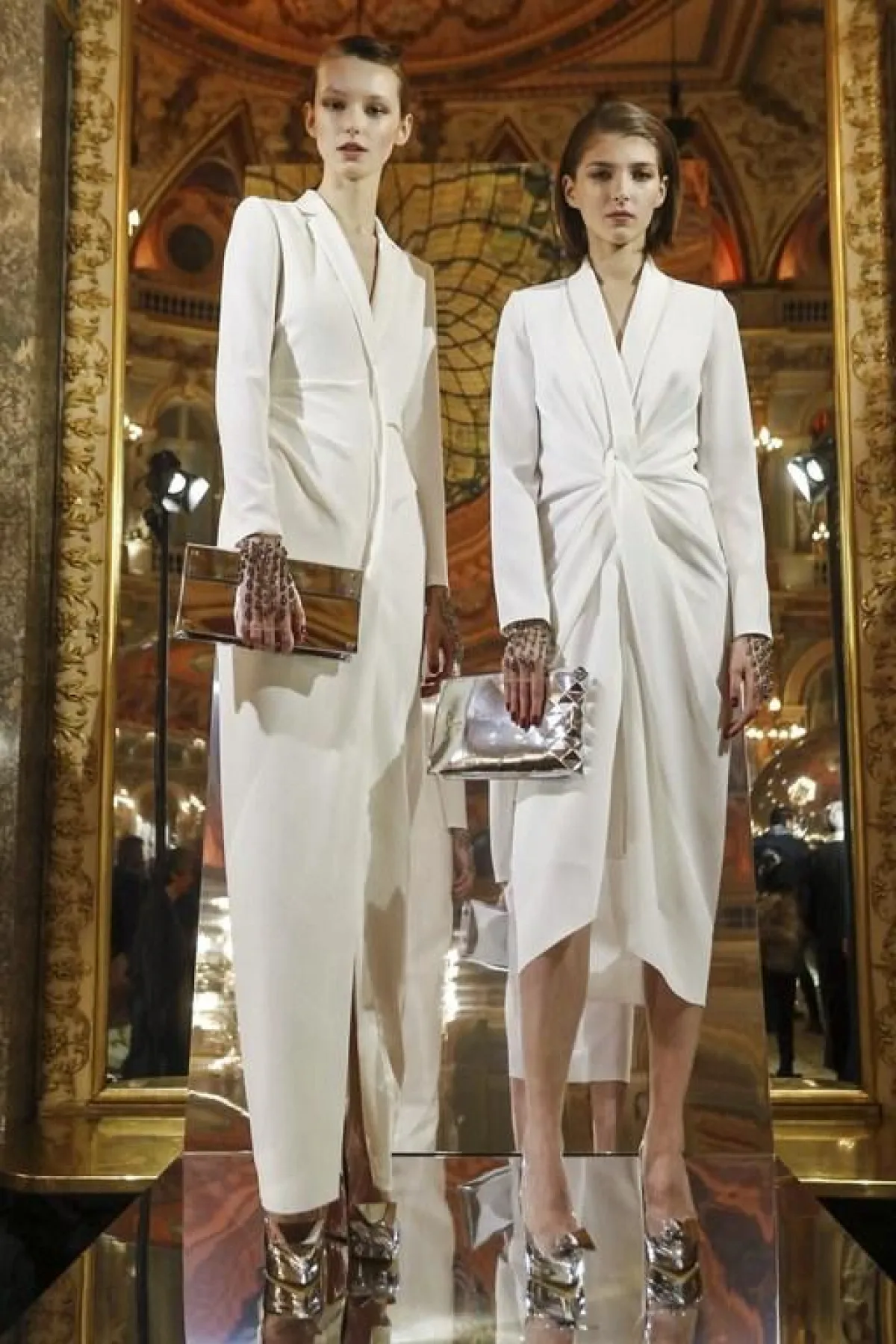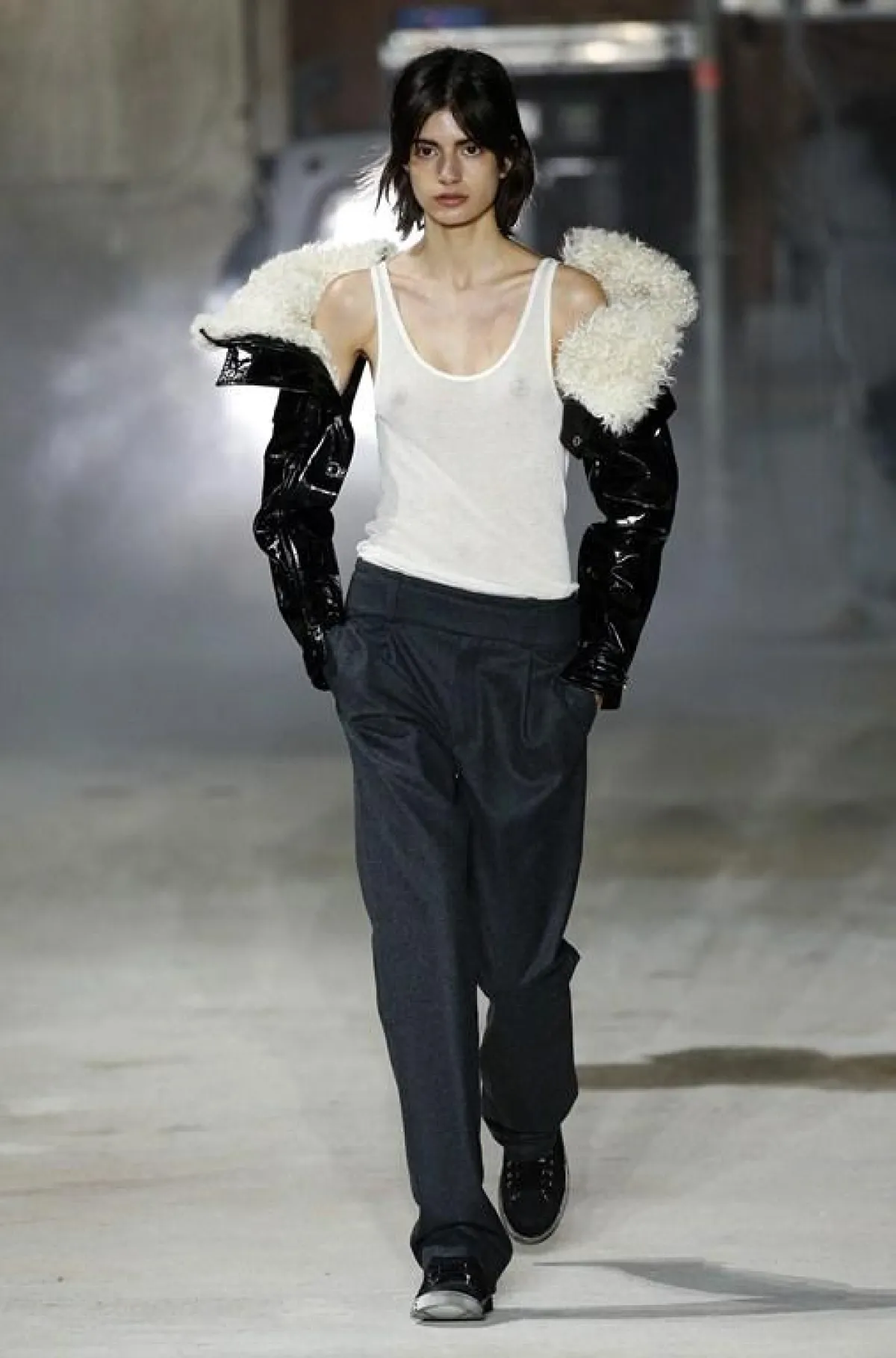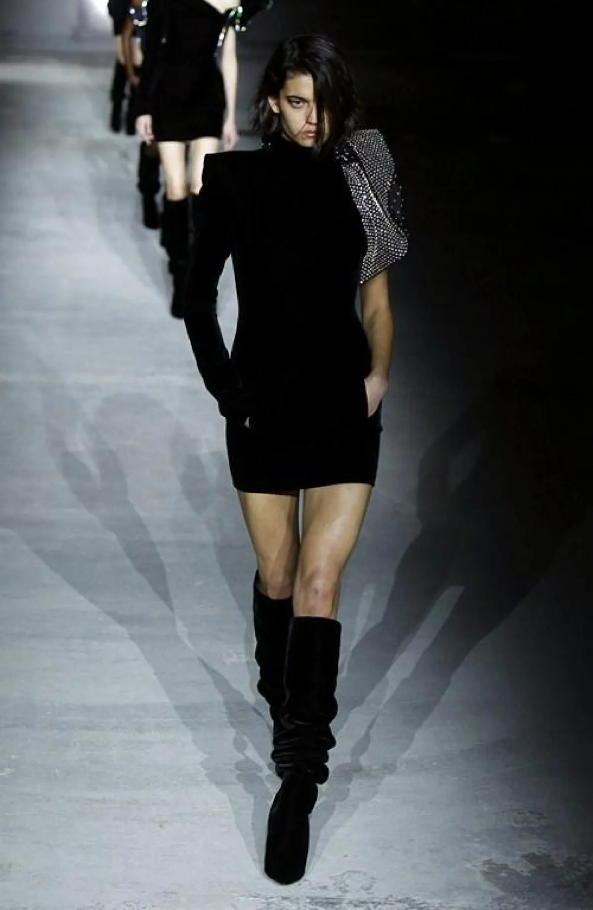 أما المصمم "انطوني فاكاريلو"Antony Vaccarello مصمم دار "سان لوران" Saint Laurent فقد بقي وفيا لعشقه الكبير للون الأسود وكذلك الجلد، حيث قدم أزياء غلب عليها بقوة الجلد اللماع، جسده في مجموعة من الفساتين والتنانير القصيرة ذات القصات الجريئة، تلاعب المصمم بالجلد حيث طعم معظم الأزياء التي عرضها بالمثنيات صاحبتها الأحذية الشتوية العالية والقفازات التي صنعت من الجلد المثني .