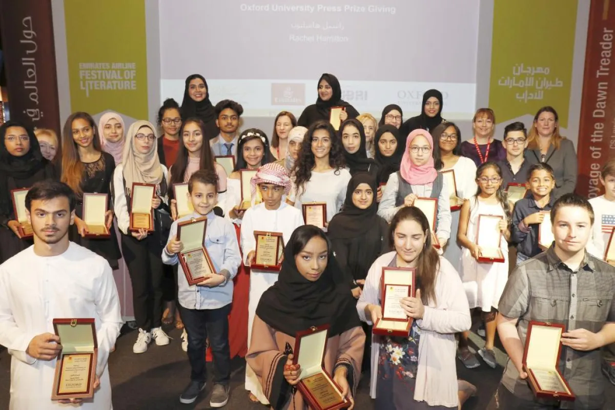 تُعد مسابقات الكتابة لجميع الأعمار (باللغتين العربية والإنجليزية)، من أهم فعاليات مهرجان طيران الإمارات للآداب؛ إذ تتيح للطلبة تقديم مواهبهم؛ من خلال المشاركات الشعرية، والكتابات القصصية، ومهارات القراءة وعروض الأداء. ودار جامعة أكسفورد للطباعة والنشر (OUP) تُعتبر أكبر دار طباعة جامعية في العالم، تقوم بطباعة أكثر من 6 آلاف مصنف سنويًا، توجد فروعها في أكثر من 50 دولة. وقامت بالأمس بتوزيع جوائزها على الفائزين في مسابقة «دار جامعة أكسفورد» للطباعة والنشر الخاصة بكتابة القصة 2017، الخاصة بالجيل الجديد من الكتّاب، حيث حصل الفائزون على الكؤوس والكتب التذكارية للأعمال الفائزة التي تضم الأعمال المشاركة باللغتين العربية والإنجليزية.
