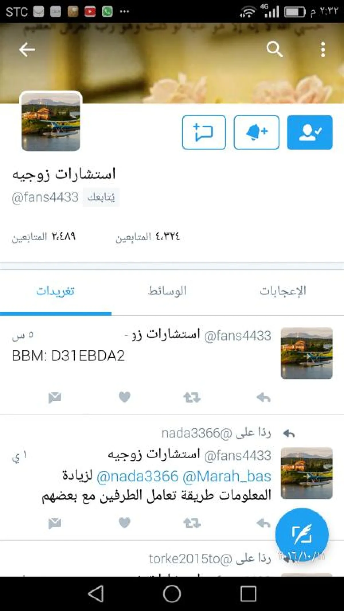 وتواصلت «سيدتي» مع أحد الحسابات المنتشرة في موقع التواصل «تويتر»، وسألته هل أنت مستشار أسري؟ فأجاب بنعم وذكر اسمه وطلب أن أحكي له المشكلة، لكن عند ردي بأنني إعلاميَّة ولا توجد مشكلة قام بعمل «بلوك» وحذف الحساب.