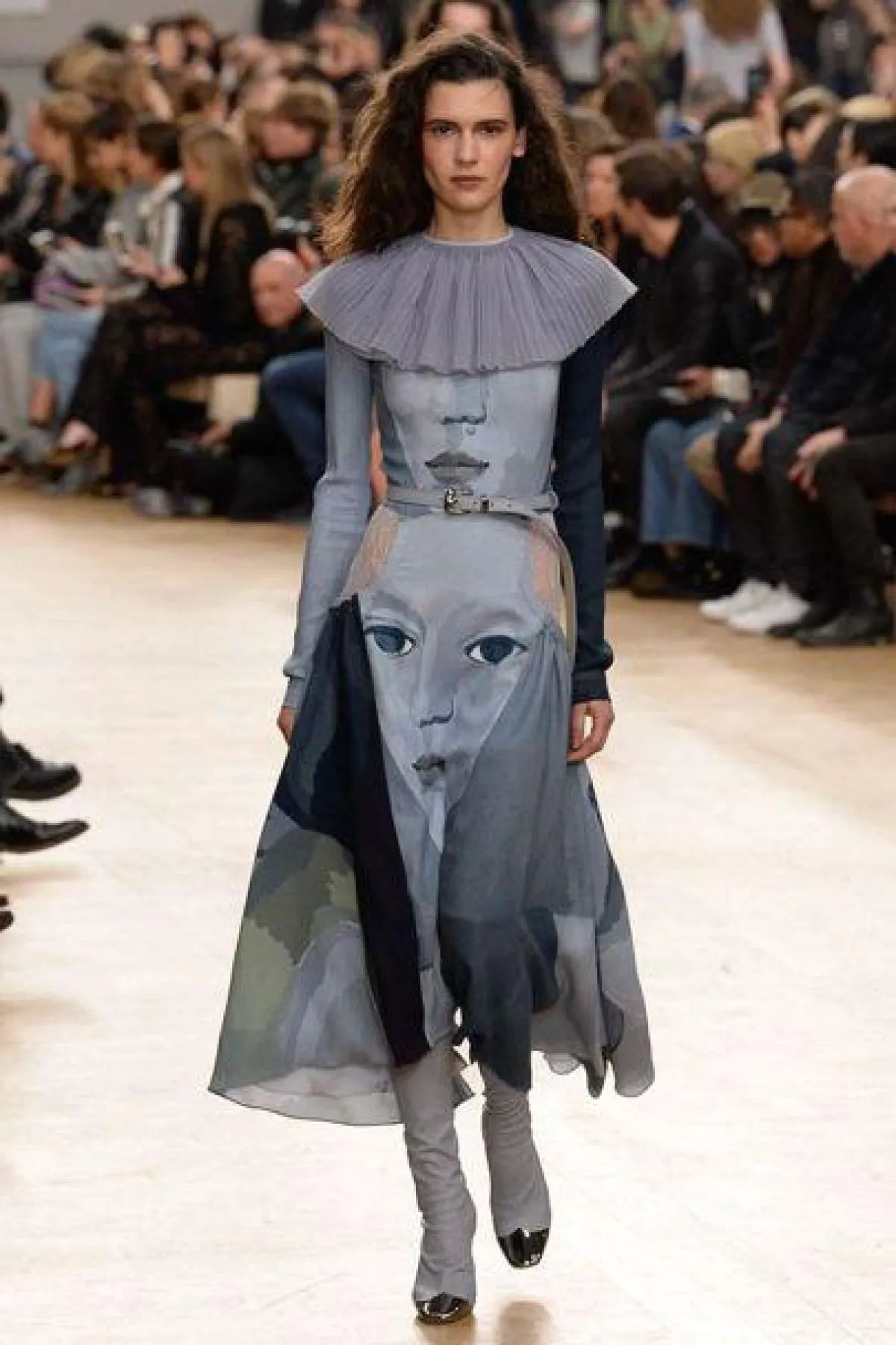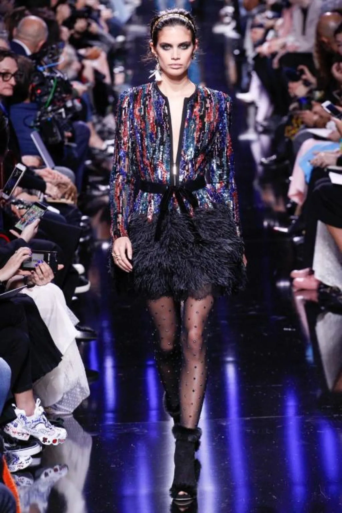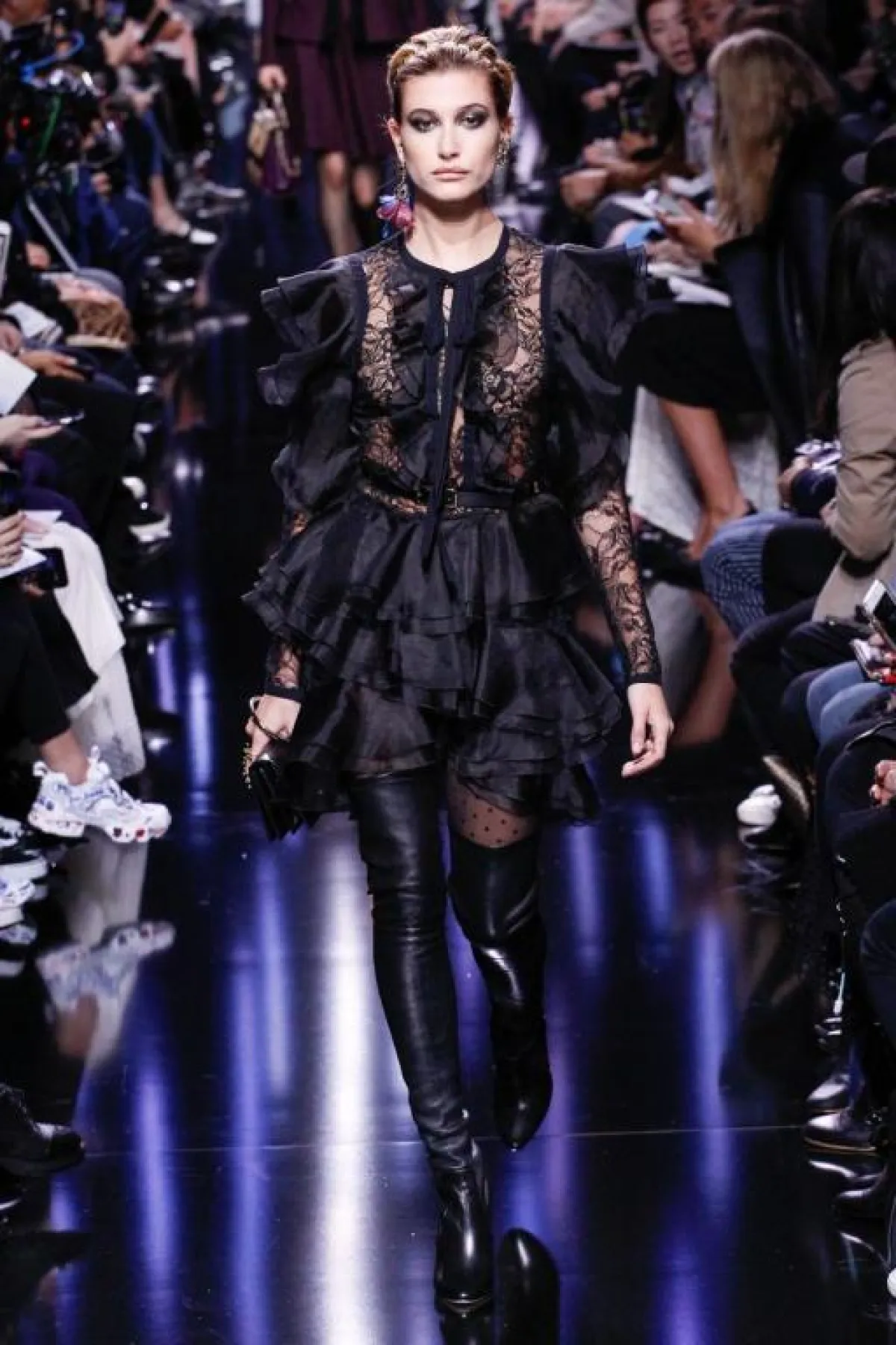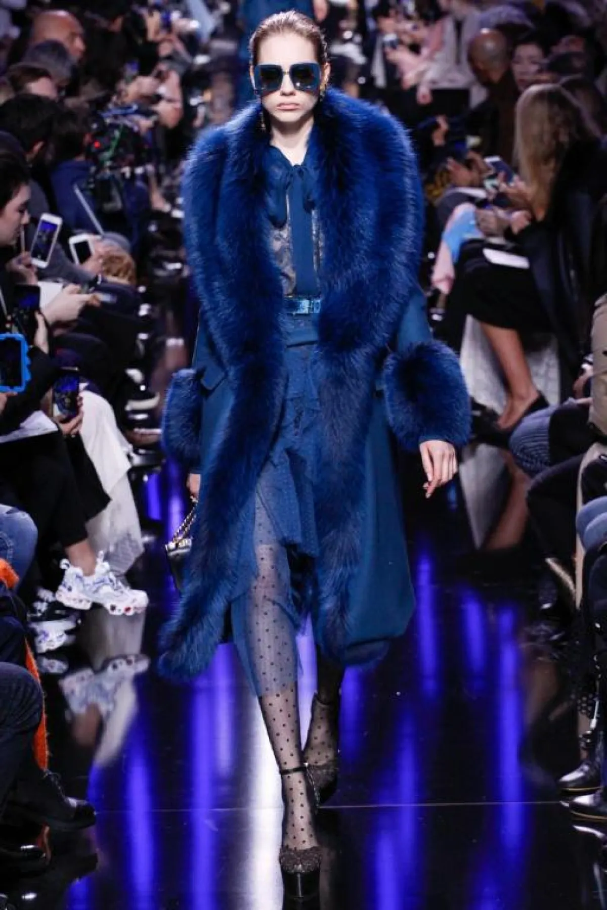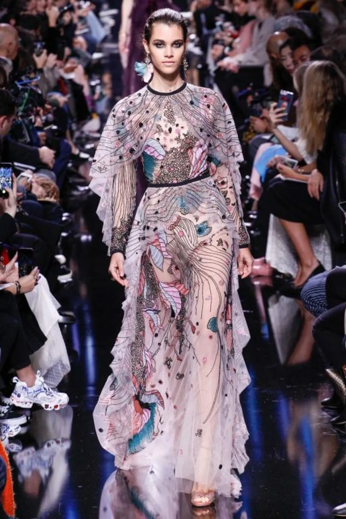 وبعد ذلك قصدنا الـ "غراند باليه" Grand Palais لمتابعة عرض أزياء مجموعة "ايلي صعب" Elie Saab، وعند وصولنا تفاجئنا بالحشود الغفيرة المترقبة العرض وبالرغم من الأمطار في باريس يوم أمس هذا لم يمنع الحضور من اختيار أجمل الملابس لحضور العرض المرتقب، والمجموعة كانت تستحق العناء، حيث وبمجرد أن بدأ العرض نسينا المطر ودخلنا الأجواء الرمانسية الحاملة في مشهد ضبابي من المسرحية الغنائية الشهيرة "جيزيل" الذي استوحى منها "ايلي صعب" Elie Saab مجموعته وقد بدت التصاميم أثيرية تراعي تبدل الأمزجة والمفارقات الواسعة في الأشكال والقصات. وشاهدنا تشكيلة رائعة من الفساتين القصيرة وفساتين السهرة الباهرة وقد تزاوجت فيها أقمشة الأورغانزا والحرير والشيفون، والمخمل والدانتيل بأسلوب حسّي مرهف، بلوحة ألوان حالمة تدرجت بين الأزرق، والأسود الحالك، والأحمر الخجول، والأبيض والبيج الداكن. وبالنسبة للاكسسوارت فقد تميزت بتفاصيلها الغنية بالذهب والجلد المخرم والفرو.