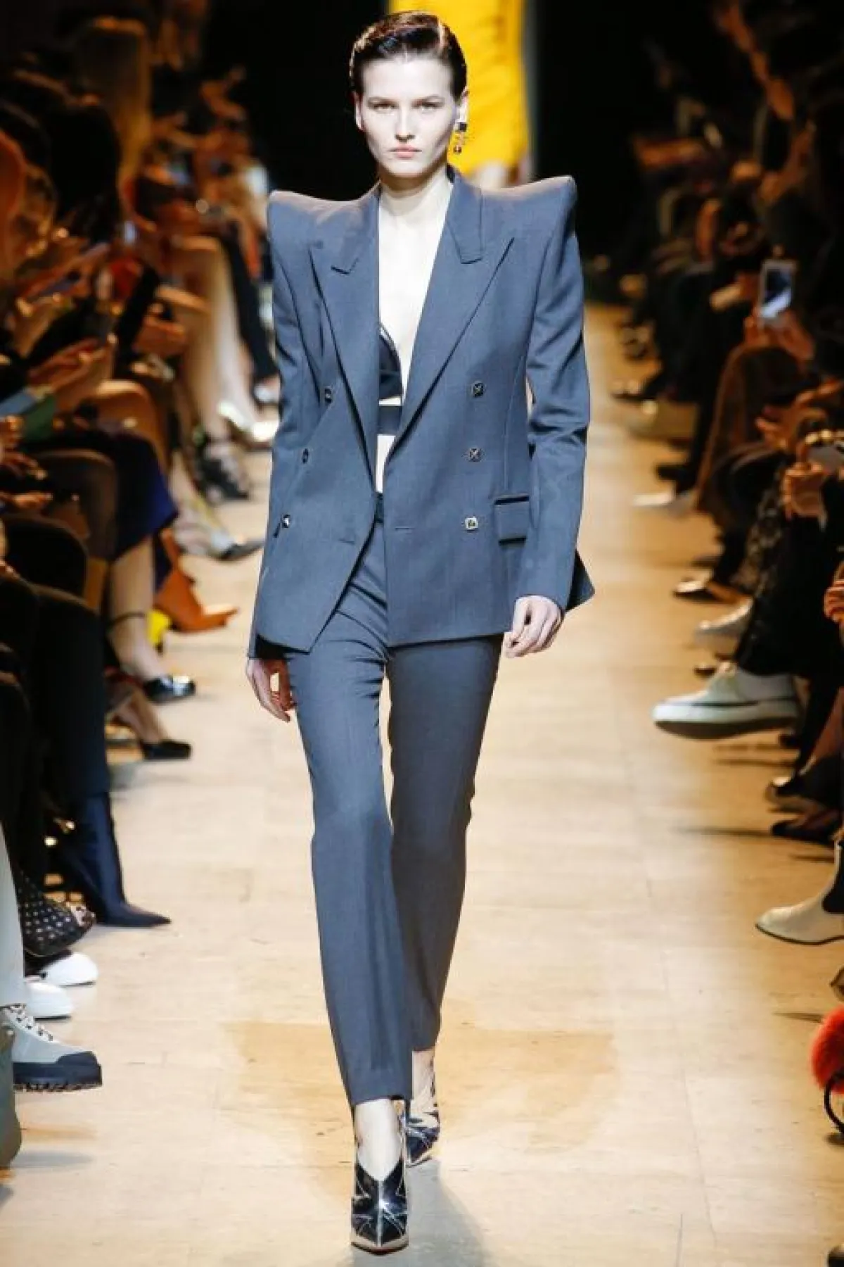 بدأنا اليوم الخامس من أسبوع الموضة في باريس لموسم خريف وشتاء 2017-2018 للألبسة الجاهزة في كواليس عرض دار "موغلر" Mugler حيث شاهدنا عن قرب الملابس المعلقة بانتظار أن ترتديها العارضات على منصة العرض، كما تابعنا خطوات الماكياج مع فريق عمل "كلارنس" Clarins، ومن ثم انتقلنا الى الصالة حيث بدأ العرض بتصاميم لافتة ومبتكرة ركزت على اظهار الجانب القوي من المرأة الخاصة بدار "موغلر" Mugler مع الأكتاف العريضة -التي وعلى ما يبدو ستكون من صيحات الموضة الأبرز للموسم القادم- والخصر الضيق الى جانب الأقمشة المعدنية البراقة التي كشفت عن جاذية عصرية لافتة، كما كان للنجمة حضور قوي على المجموعة من خلال الاكسسوارت أو الطبعات على الأقمشة، ولطالما كان لشعار النجمة ارتباط قوي بدار "موغلر" Mugler ووجود أساسي في الأرشيفات. وشاهدنا تصاميم الفساتين القصيرة، والبدلات مع الأكتاف البارزة، والمعاطف وموديلات الجمبسوت أيضاً.