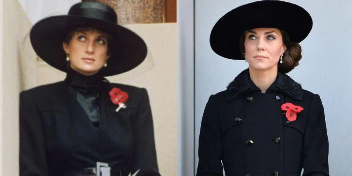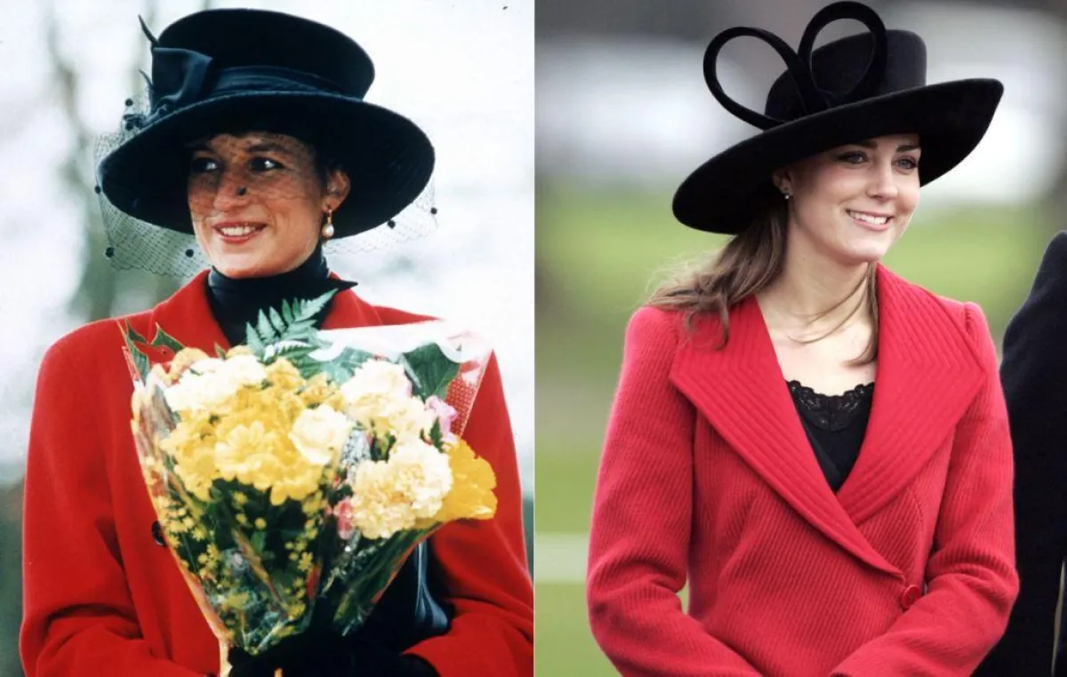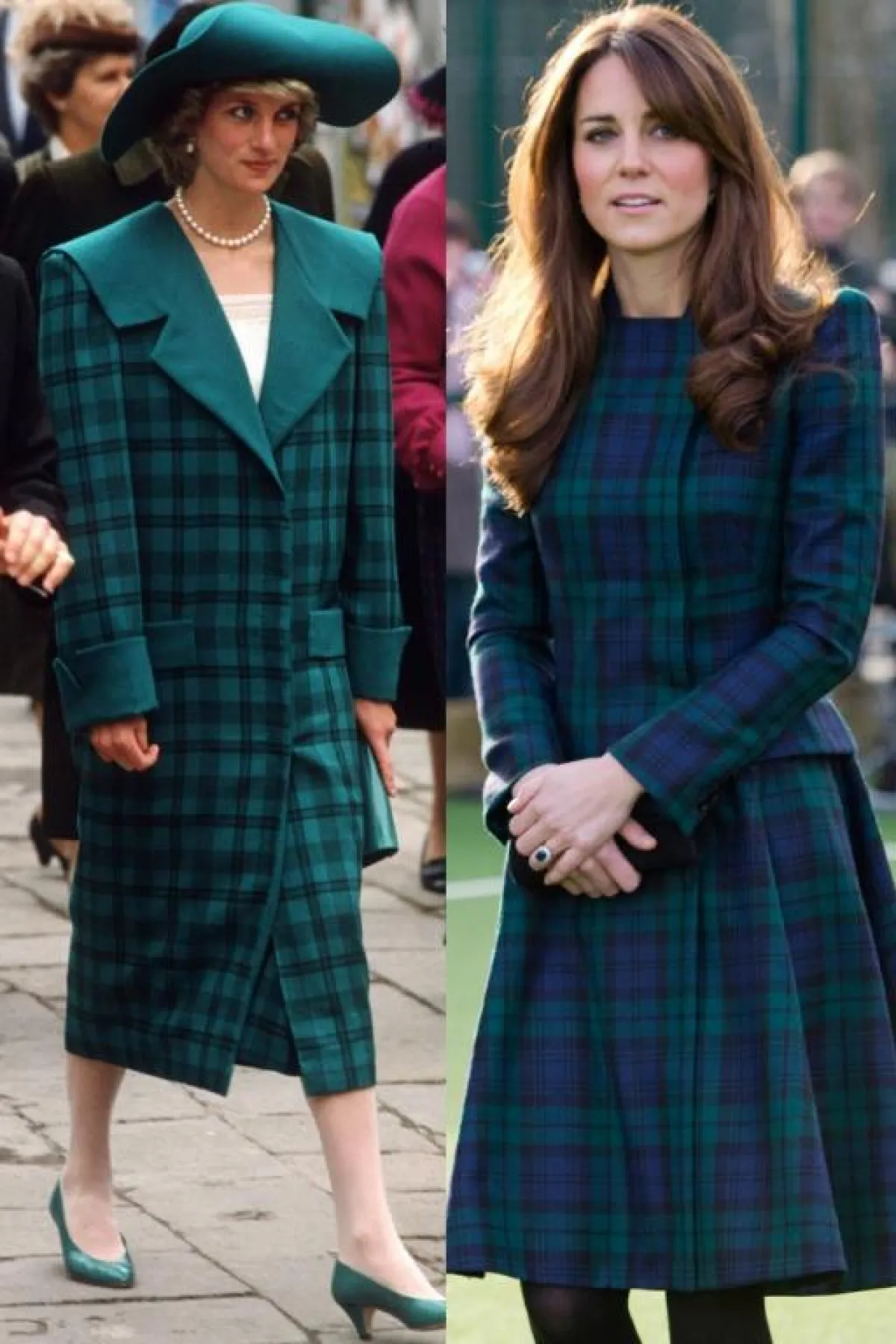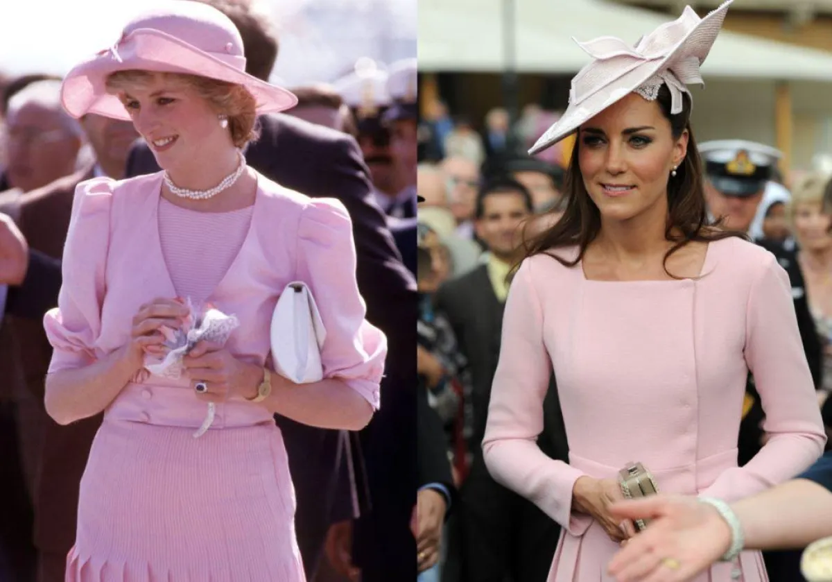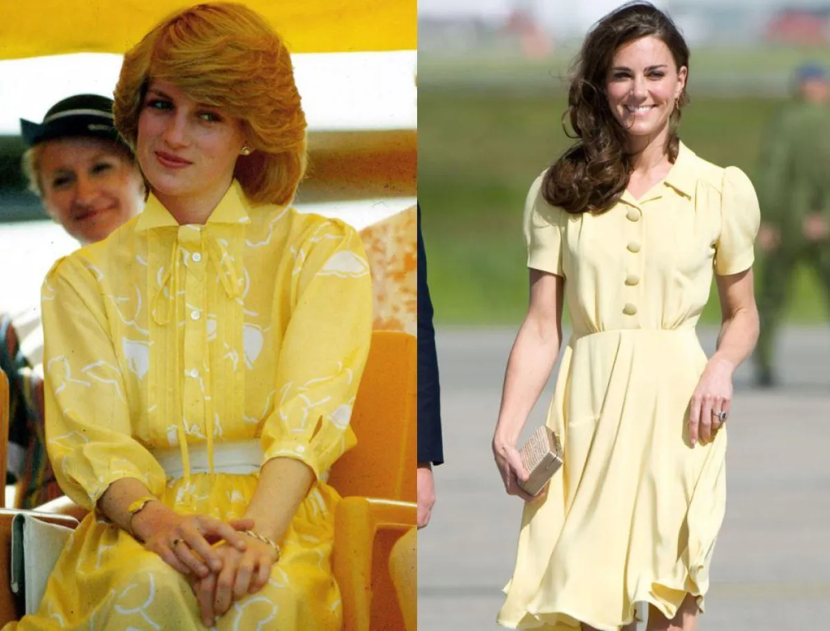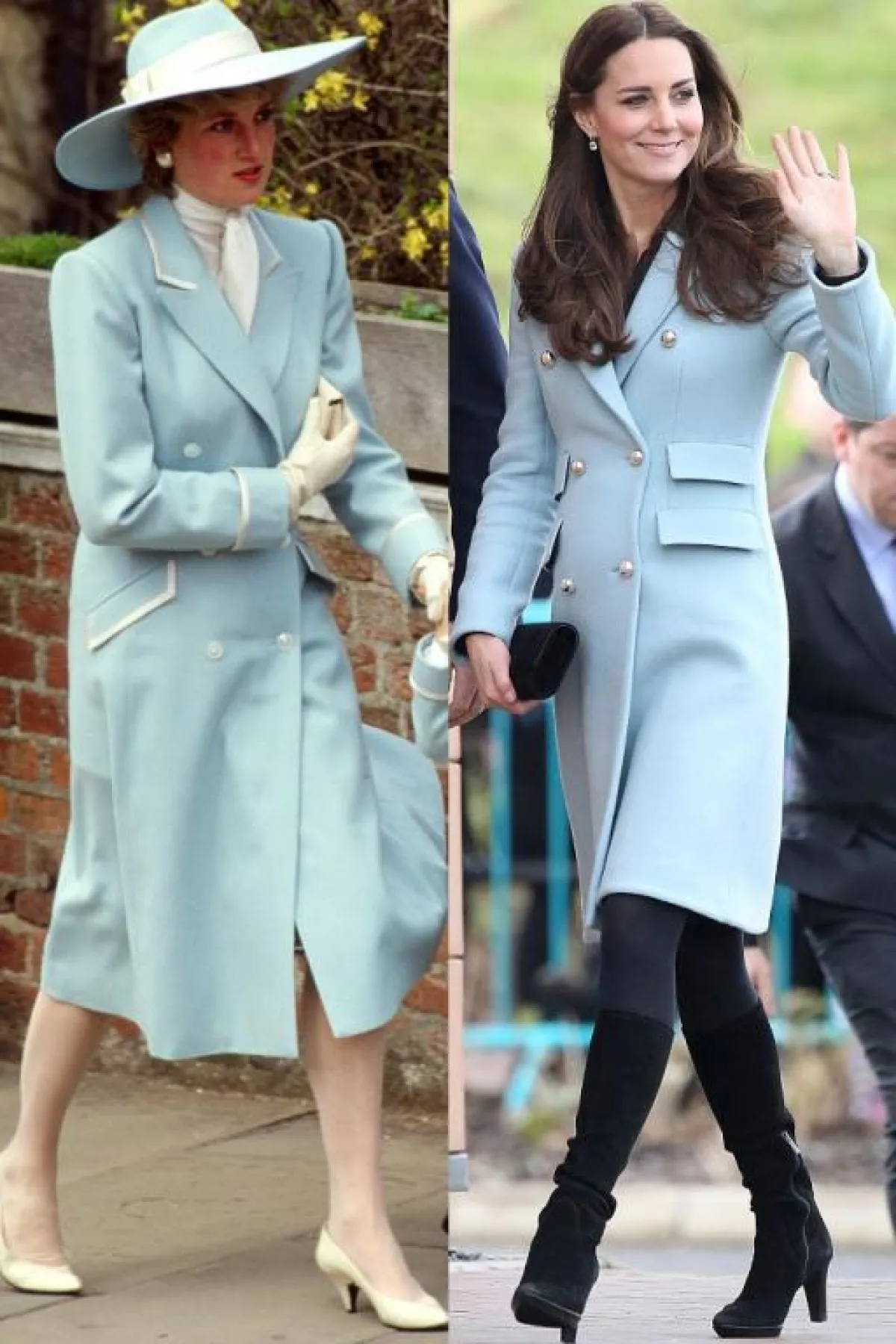 فمن خلال جولة قمنا بها على إطلالات كيت ميدلتون المتنوعة، سواء في الأزياء الرسمية أو في الإطلالات اليوميّة، لاحظنا أنّ شبَهاً كبيراً في اختيار الأزياء يجمعها مع الراحلة ديانا. فقد ارتدت كلّ من كيت وديانا، معطفاً أسودَ مزيّناً بثلاث ورود حمراء على جانبه، مع قبّعة سوداء كبيرة، كما ظهرت كيت بإطلالة بفستان قصير باللون الورديّ الفاتح، مع قبّعة تشبه إلى حدّ كبير، إطلالة الأميرة ديانا بفستان ورديّ فاتح مع قبّعة أيضاً، ولكن بتصميم مختلفٍ قليلاً. ولم يغب التشابه في انتقاء الأزياء عن الإطلالات اليوميّة أيضاً، فرأينا كلاً من كيت وديانا، بفستان أبيضَ مزيّن بدوائرَ من اللون الأسود، اختارتاه لإطلالة مريحة وعفوية. بالإضافة إلى إطلالات أخرى مشابهة إما بالتصاميم أو بالألوان، وأحياناً يكون التشابه التي نُسقت مع الإطلالة، مثل القبّعات وحقائب اليد وغيرها.