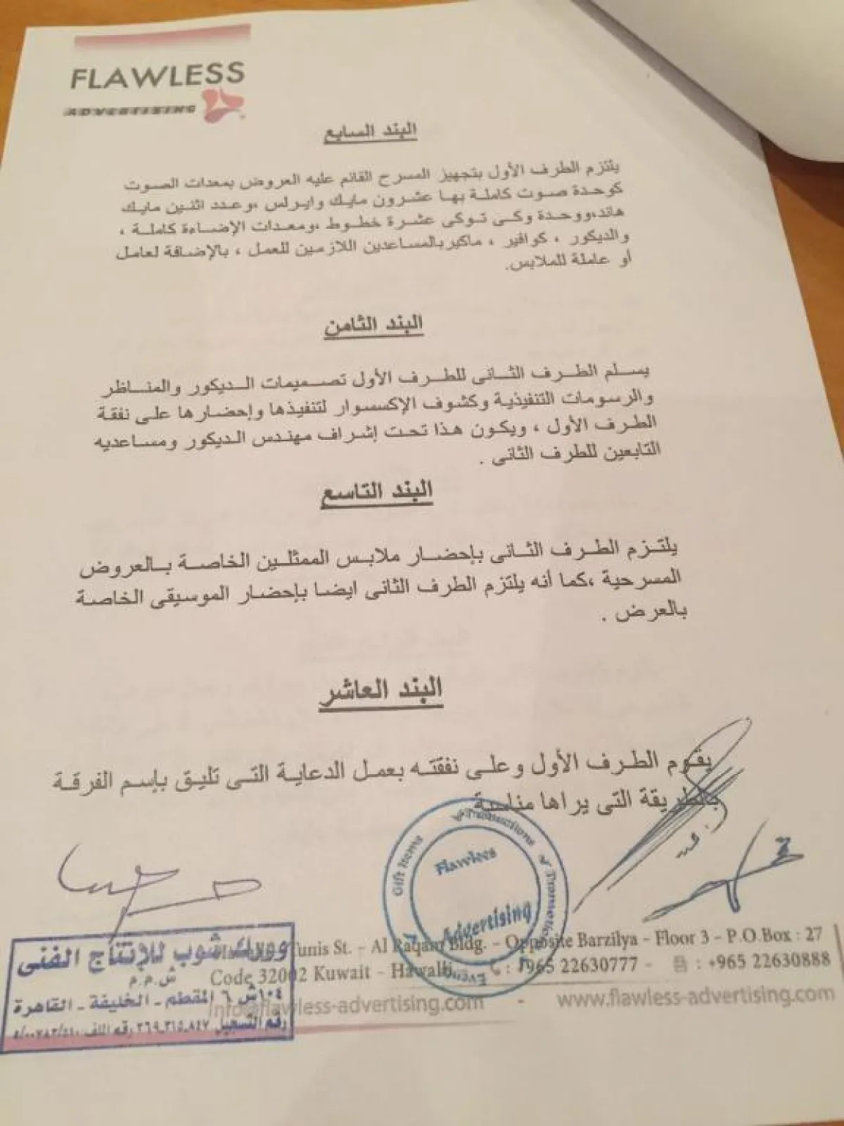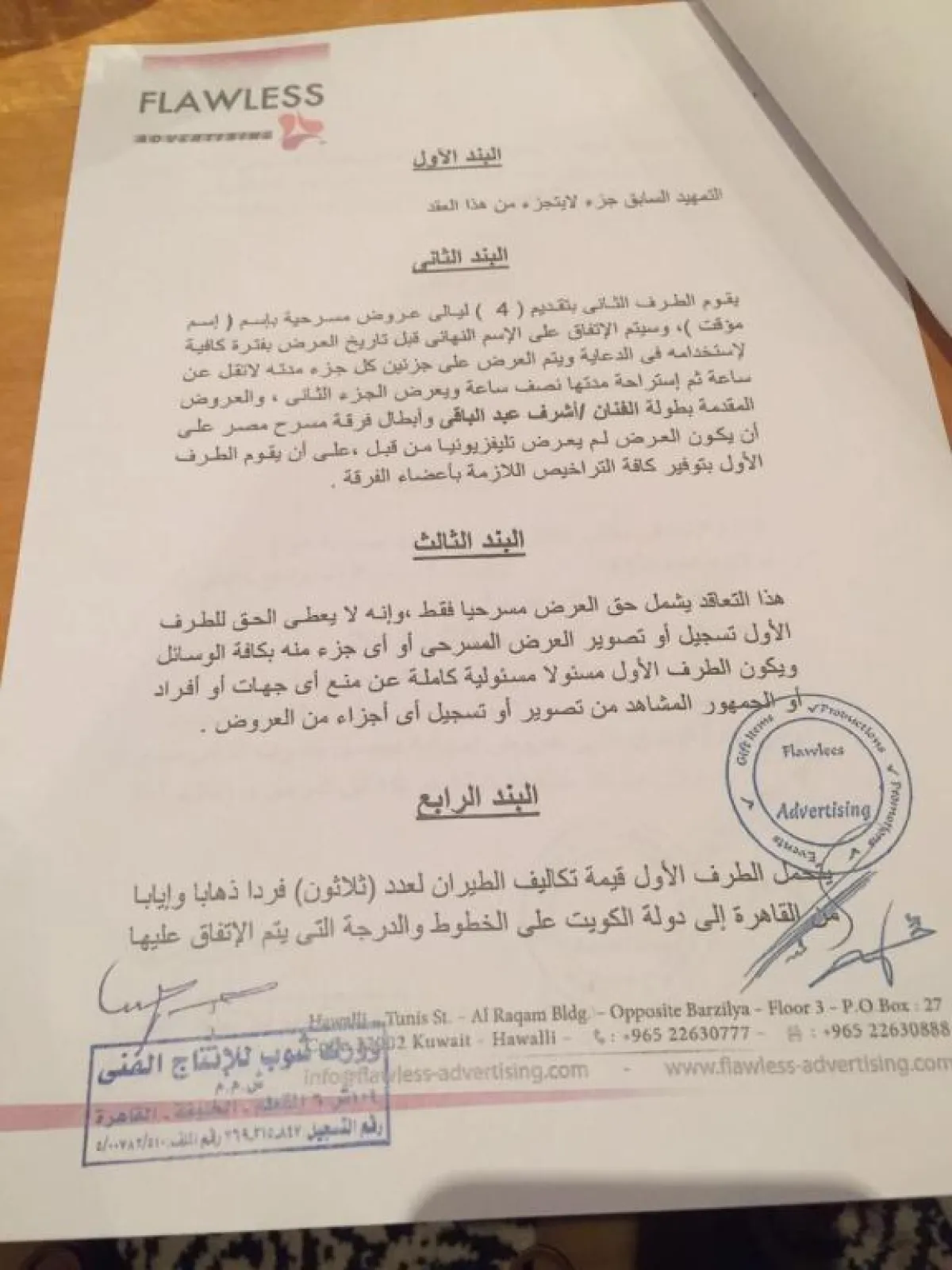 واستطرد أشرف: " وبمجرد وصولنا لم أجد اهتماماً بتخليص إجراءات الفرقة، أسوة بما حدث معنا في العامين الماضيين. وتقبّلت الأمر إلى أن أنهينا جميع الإجراءات، وخرجنا لساحة الاستقبال في المطار. وحينها لمست تذمّراً غيرَ مفهوم من المنظّمين بذريعة عدم حضور علي ربيع، ولم أفهم السبب وراء ذلك، خصوصاً وأنّ العقود المبرمة بيننا لم تنصّ صراحة على وجود شخص باسمه، وأنّ مقترح حضور علي جاء في وقت لاحق، وبناءً عليه أضفنا أجره بخطاب منفصل ، وهنا استشعرت محاولاتٍ للتملّص من الالتزامات الماديّة، خصوصاً وأنني تقبلت عدم حصولنا على 50 في المئة من الأجر المتّفق عليه بالقاهرة، على أن تسدد الـ50 في المئة الأخرى بمجرد وصولنا الكويت، وهو أيضا بندٌ واضحٌ وصريح منصوصٌ عليه في العقد، وتقبلت تسديد ما قيمته 23 في المئة فقط، وطلبوا تأجيل الحصول على باقي المستحقات إلى ما بعد العرض الأول، وتقبلت الأمر أيضاً ولكنها كانت مجرد وعود".
