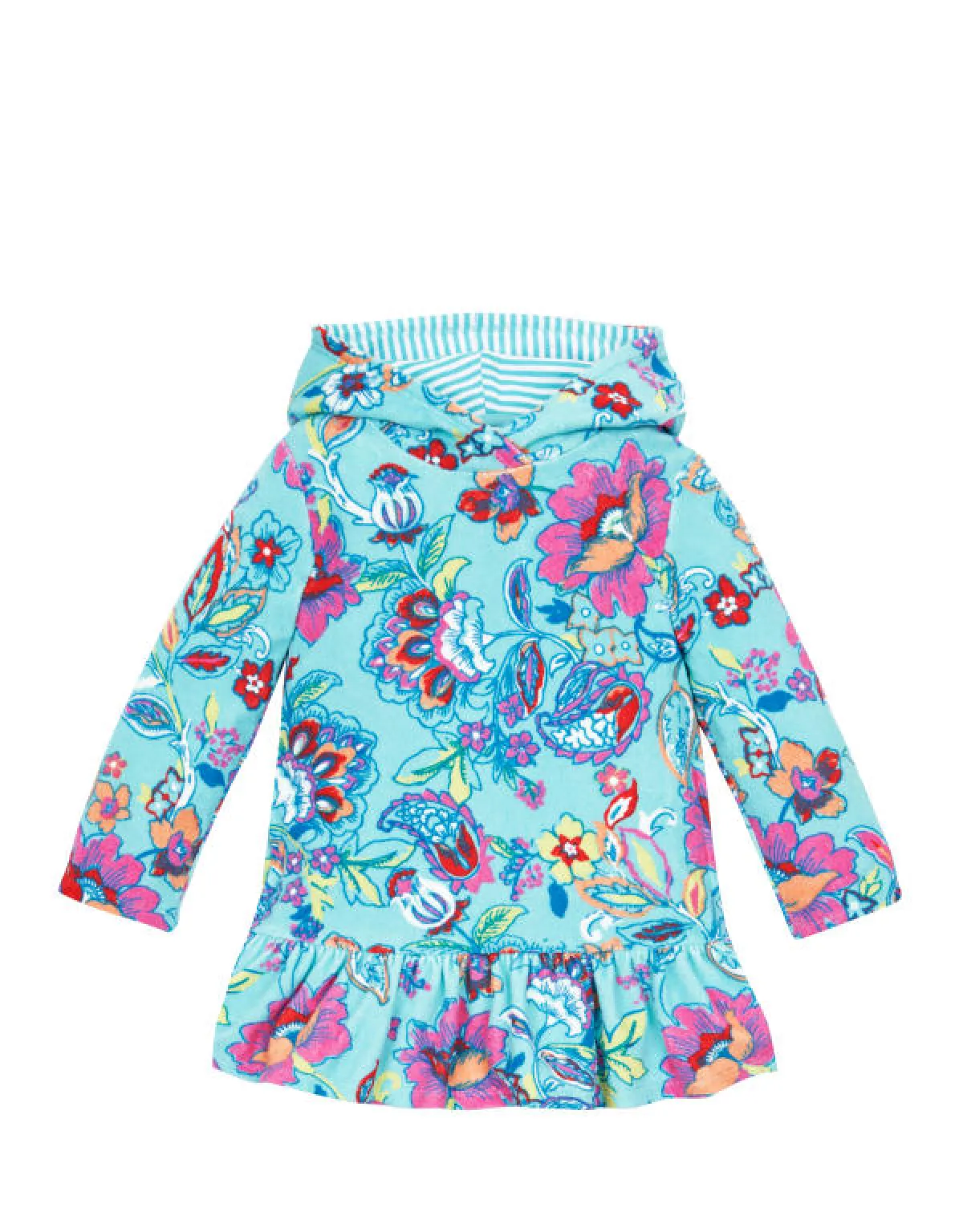 بلوزة زرقاء بكمَّين طويلين وقبعة مطبَّعة بورد ملون