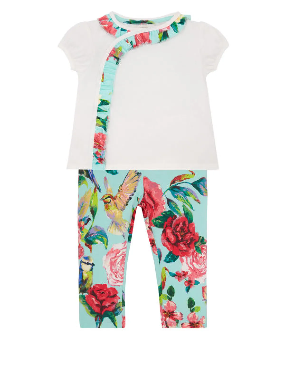 بلوزة بيضاء مع بنطلون أخضر فاتح مزين بورد ملون