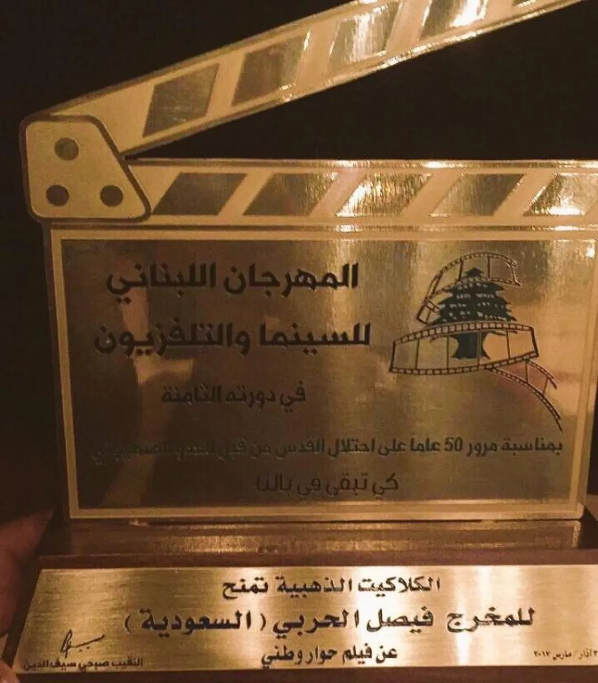 كرم المهرجان اللبناني للسينما والتلفزيون بدورته الثامنة بعنوان "القدس"، برئاسة نقيب السينمائيين اللبنانيين المخرج صبحي سيف الدين، الفيلم السعودي "حوار وطني" للمخرج فيصل الحربي، وقام تسليمه جائزة "الكلاكيت" الذهبية.