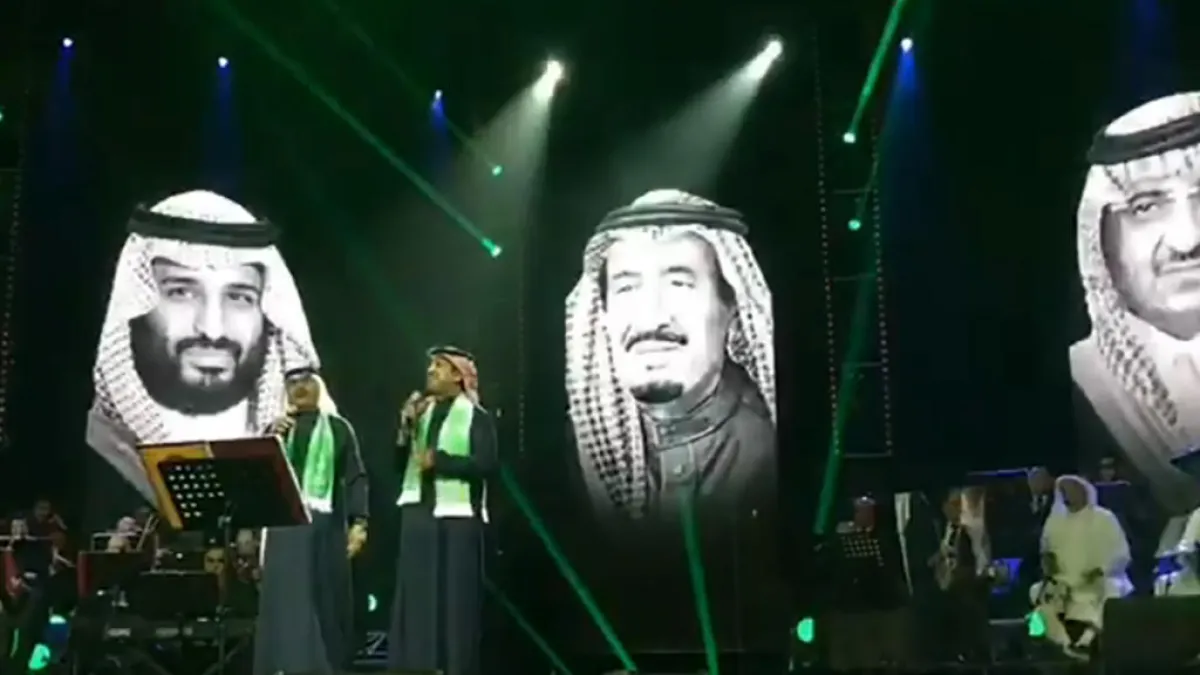قائلاً: "أستسمحكم.. ندعو أخويا راشد الماجد نغني سوا"، صفق الجمهور للنجمين، وردد مبتهجاً برؤيتهما: "نحمد الله جت على ماتمنى"، ليصدح النجمان على مسرح الملك فهد في "دويتو" تغنيا به مع الجمهور فيه طويلاً: "إنتِ ما مثلك بالدنيا بلد.. والله ما مامثلك بالدنيا بلد"، وتوشحا بالعلم السعودي في مشهد بهيج، تلته أغنية في دعم وحب الجيش السعودي: "يا نسل من حطم عروش كسرى والمجوس.. إنتم اللي فرق الروس عن تيجانها".