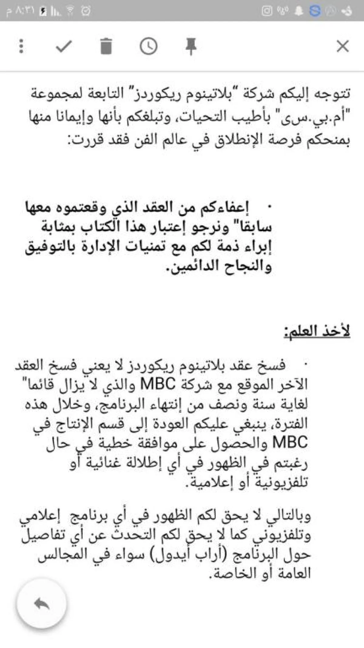 أصدرت شركة "بلاتينيوم ريكوردز" بياناً أعلمت من خلاله مشتركي "آراب أيدول" أنها أعفتهم من العقد الذي كانوا قد وقعوه معها، إيماناً منها بمنحهم فرصة الإنطلاق في عالم الفن، ولكنها شددت على أن فسخ العقد معها لا يعني فسخ العقد الموقع مع شركة MBC والذي يظل قائماً لغاية عام ونصف العام من إنتهاء البرنامج، مما يعني عدم قدرتهم على الظهور في أي برنامج إعلامي إلا بموافقة قسم الإنتاج في الشركة، أو التحدث عن تفاصيل حول برنامج "آراب أيدول" في المجالس الخاصة والعامة، كما جاء في البيان .