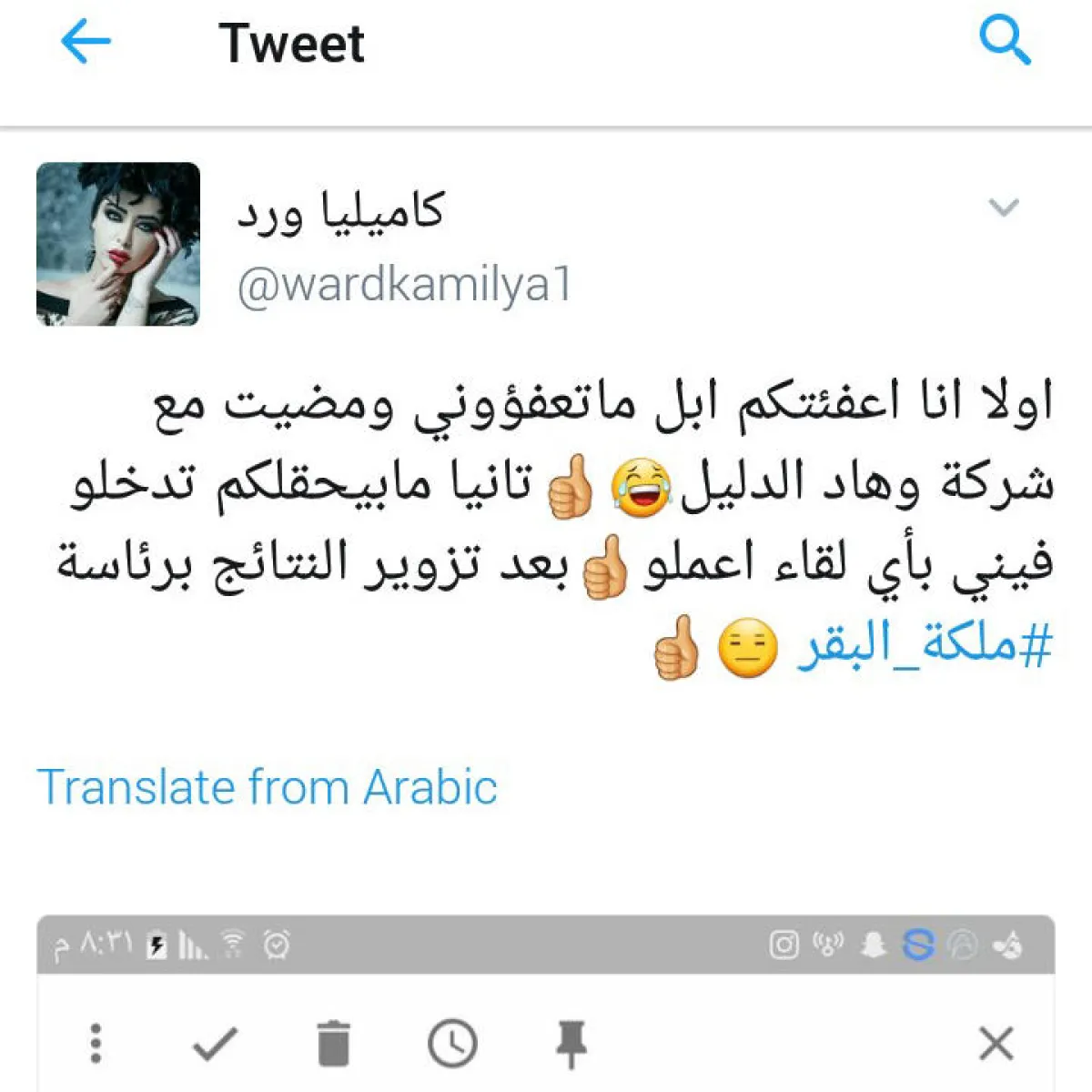 ويبدو أن بيان "بلاتينيوم ريكوردز" استفز المشتركة كاميليا ورد التي علقت عليه "أولا أن أعفيتكم قبل ما تعفوني ومضيت وهاد الدليل، ثانياً ما بيحقلكم تدخلوا فيني بأي لقاء أعمله بعد تزوير النتائج برئاسة ملكة البقر".