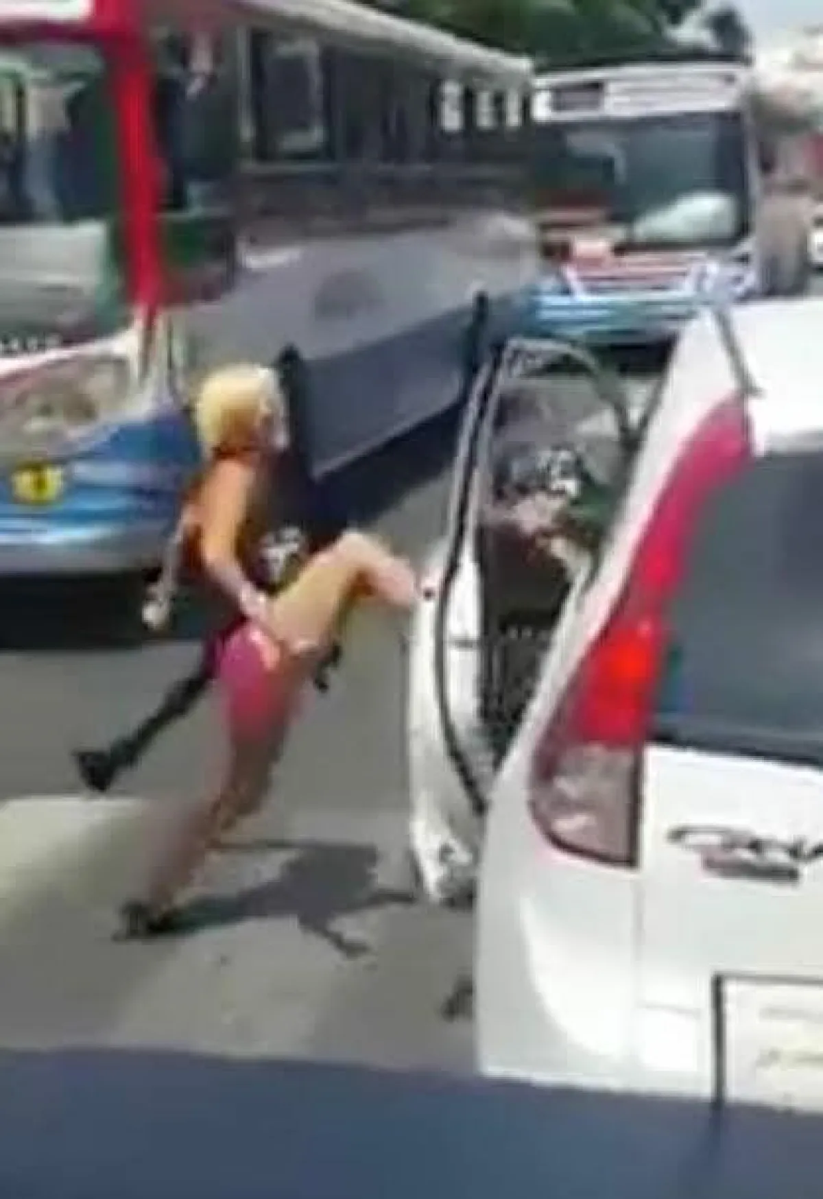 الفيديو الذي نشرته صحيفة "ميرور" البريطانية يظهر إمرأة شقراء غاضبة تنزل من سيارتها وتقوم بركل باب سيارة يقودها رجل. ولم تكتف بذلك، فعندما نزل من سيارته ليرى ما حدث، قامت بالاعتداء عليه وسط المارة، لكن الرجل الهادىء تمالك أعصابه وكان يحاول صد لكماتها فقط دون ضربها أو معاملتها بالمثل.
