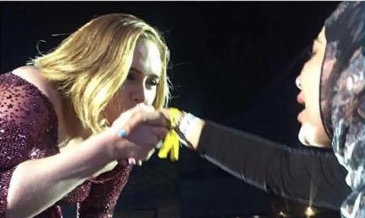 فقد ظهرت النجمة البالغة من العمر 28 عاماً في فيديو مميّز، انتشر بشكل كبير على وسائل التواصل الاجتماعي، وهي تتقدم نحو فتاة محجّبة لتلقي التحيّة عليها، فقبّلت الفتاة يد أديل بدل مصافحتها، لتبادلها الأخيرة بقبلة رسمتها على يدها وقالت لها: "لا تبكي يا حبيبتي" وأكملت طريقها على المسرح وسط حال من الذهول أصابت الفتاة.