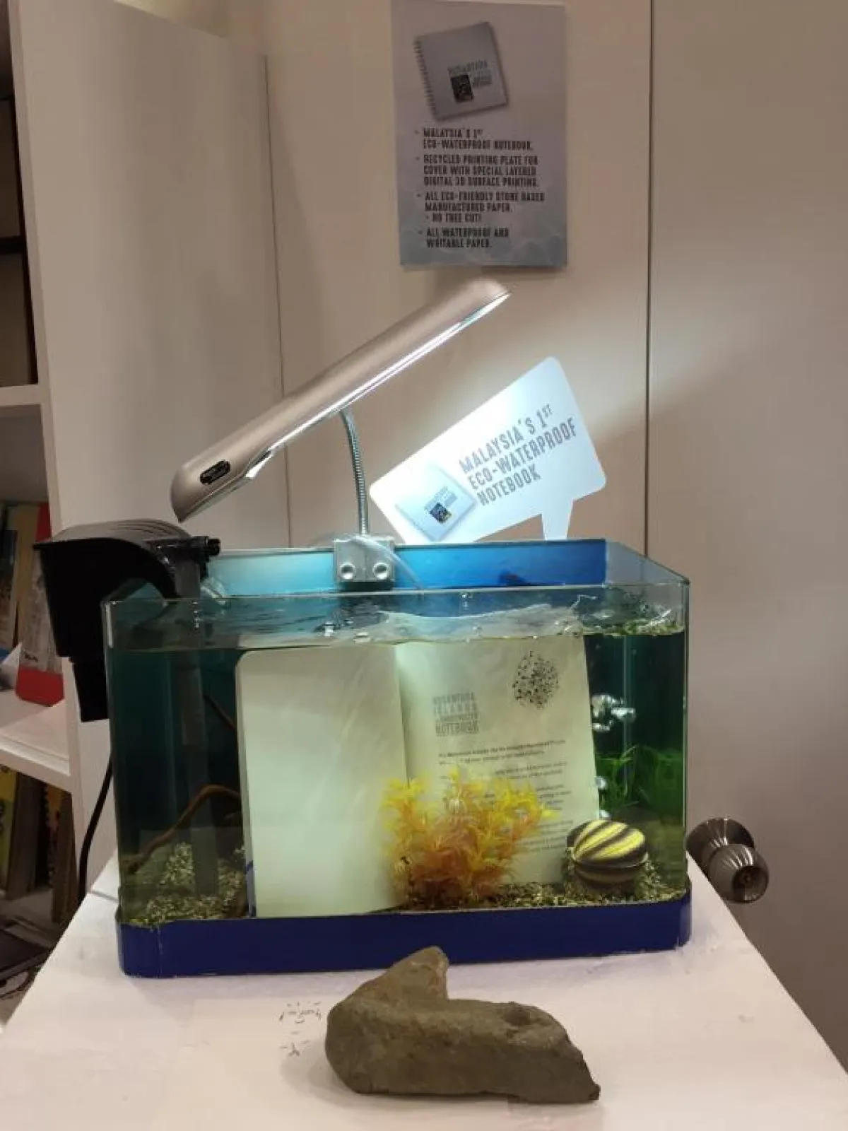 من جانب آخر، كشف جناح ماليزيا "ضيف شرف المعرض" للزوار عن تقنية جديدة، وهي استخدام ورق مضاد للماء، صُنِعَ من حجر الكلس "الجير" الذي يتوفر في جميع أنحاء العالم، ويمكن الاستفادة من هذا الورق سنوات طويلة.