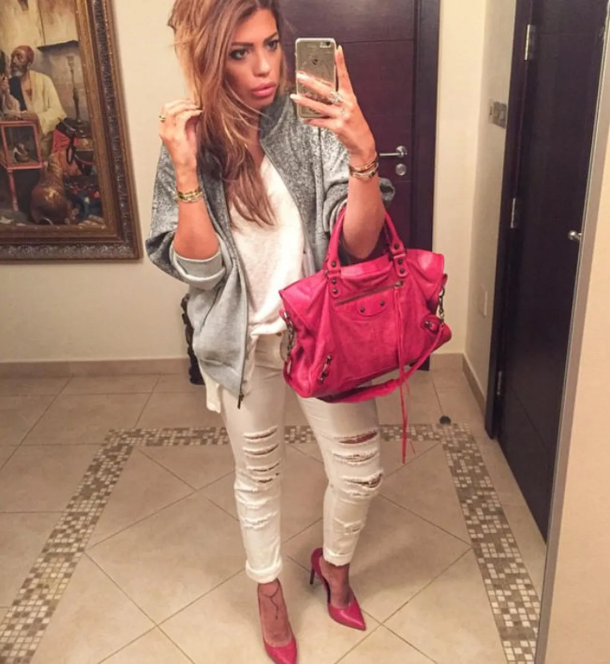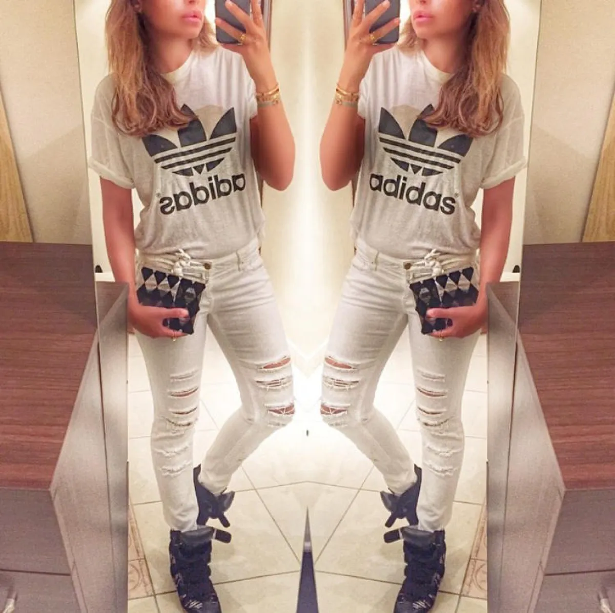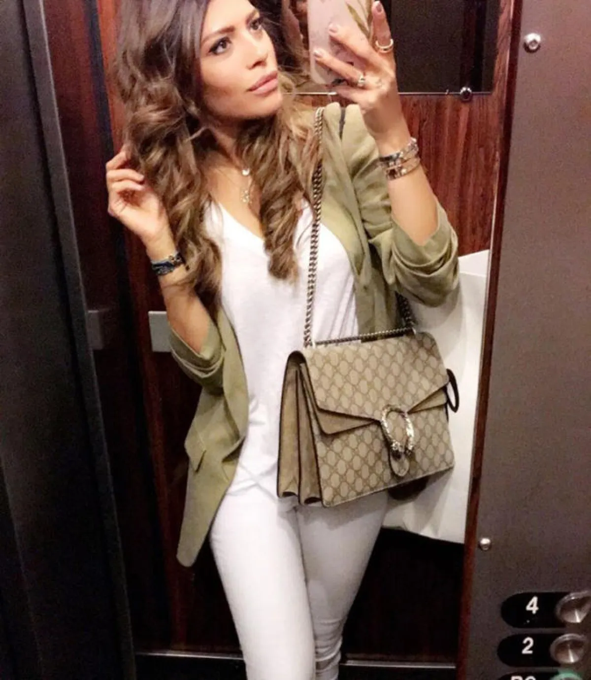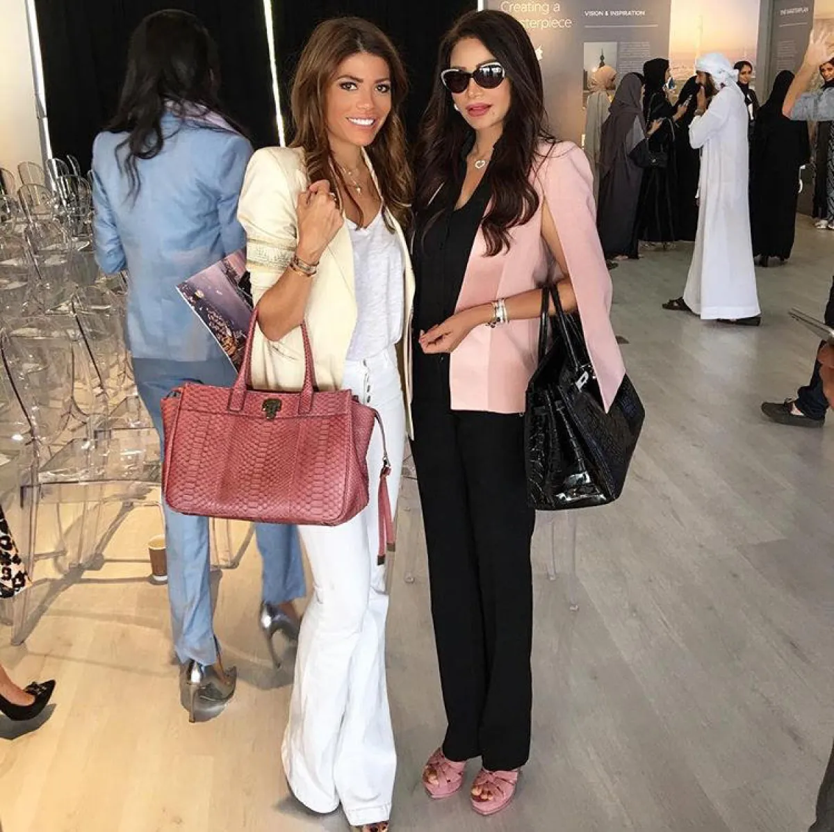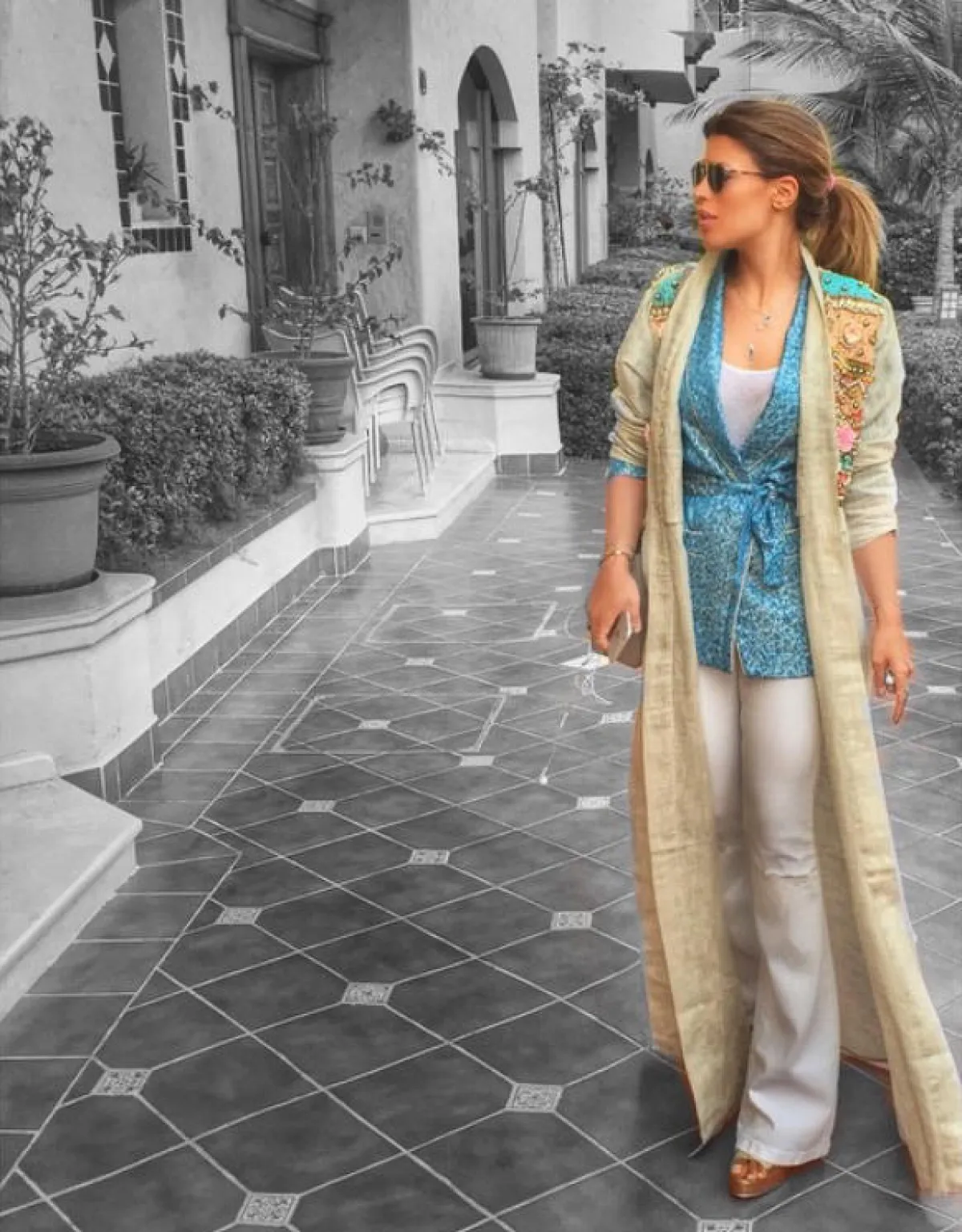 ظهرت بالإطلالة الرسميّة بالبنطلون الأبيض الواسع من الأسفل، مع الجاكيت الرسمي، جنباً إلى جنب مع الإعلاميّة "لجين عمران"، وبإطلالة أنيقة بالبنطلون الأبيض العالي الخصر مع الأزار الذهبيّة، وبالإطلالة الكاجوال بالجينز الأبيض مع الشقوق على الركبة، مرةً مع التيشيرت الرياضي، ومرةً مع الجاكيت الجينز لإطلالة صيفيّة منعشة، ولإطلالة العباية بالنقوش مع الجاكيت الطويل.