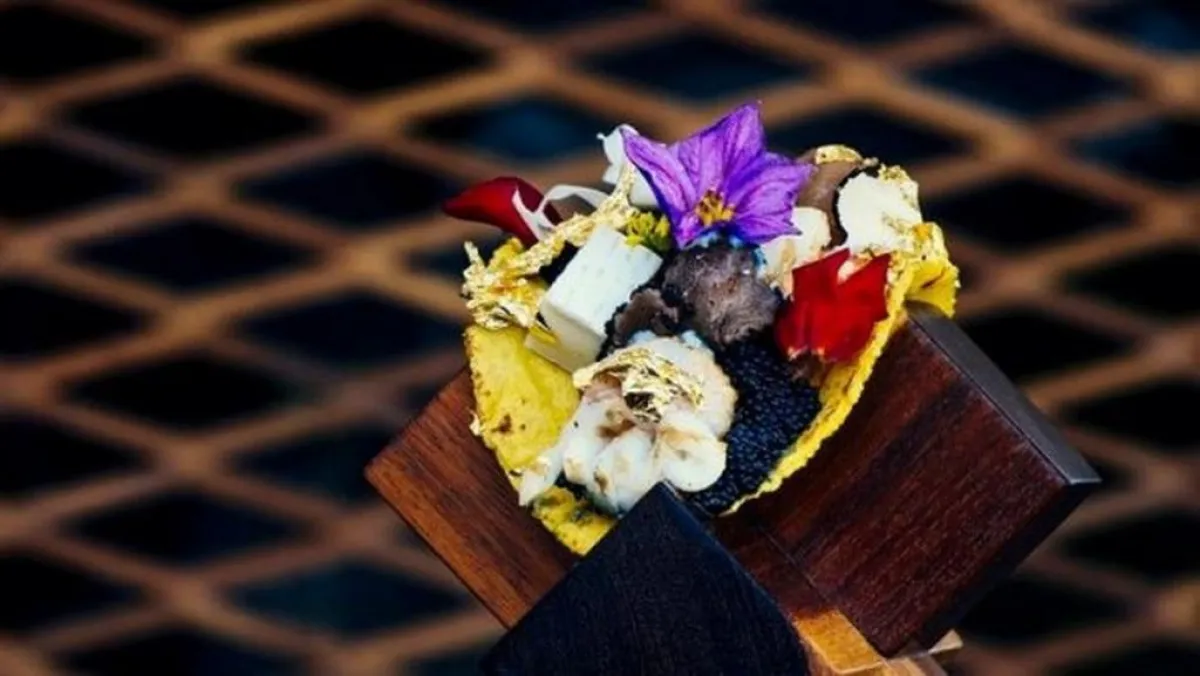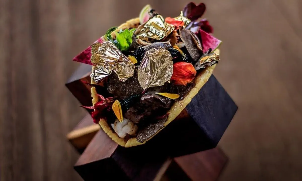 الـ"تاكو" يُقدّم على "تورتيلا" الذرة ورقائق الذهب، إلى جانب كمّ من الرقائق كمقبلات