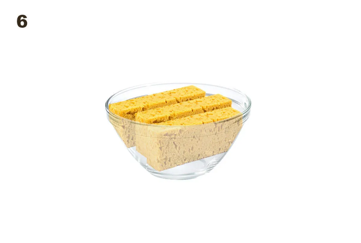6. تُصفّ مجموعة من الإسفنجات داخل الوعاء، ويُحكم الأخير جيّدًا بغطاء.