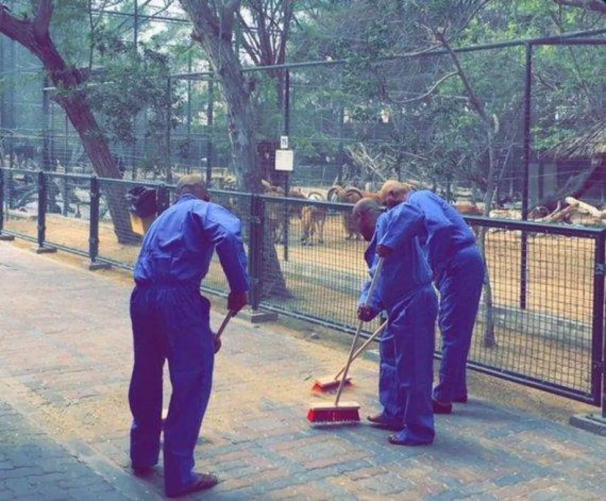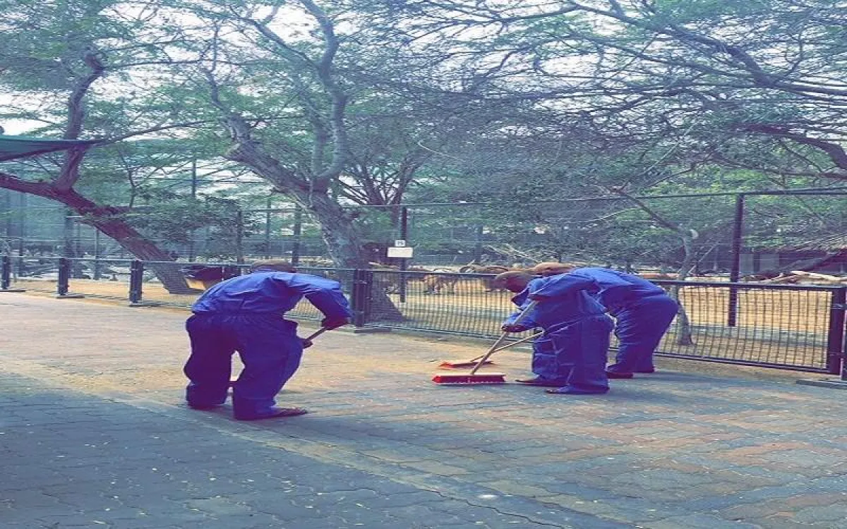 ونشرت شرطة إمارة دبي صورة لثلاثة أشخاص بلباس أزرق وهم يقومون بتنظيف أرض في ما يبدو أنها حديقة الحيوان.