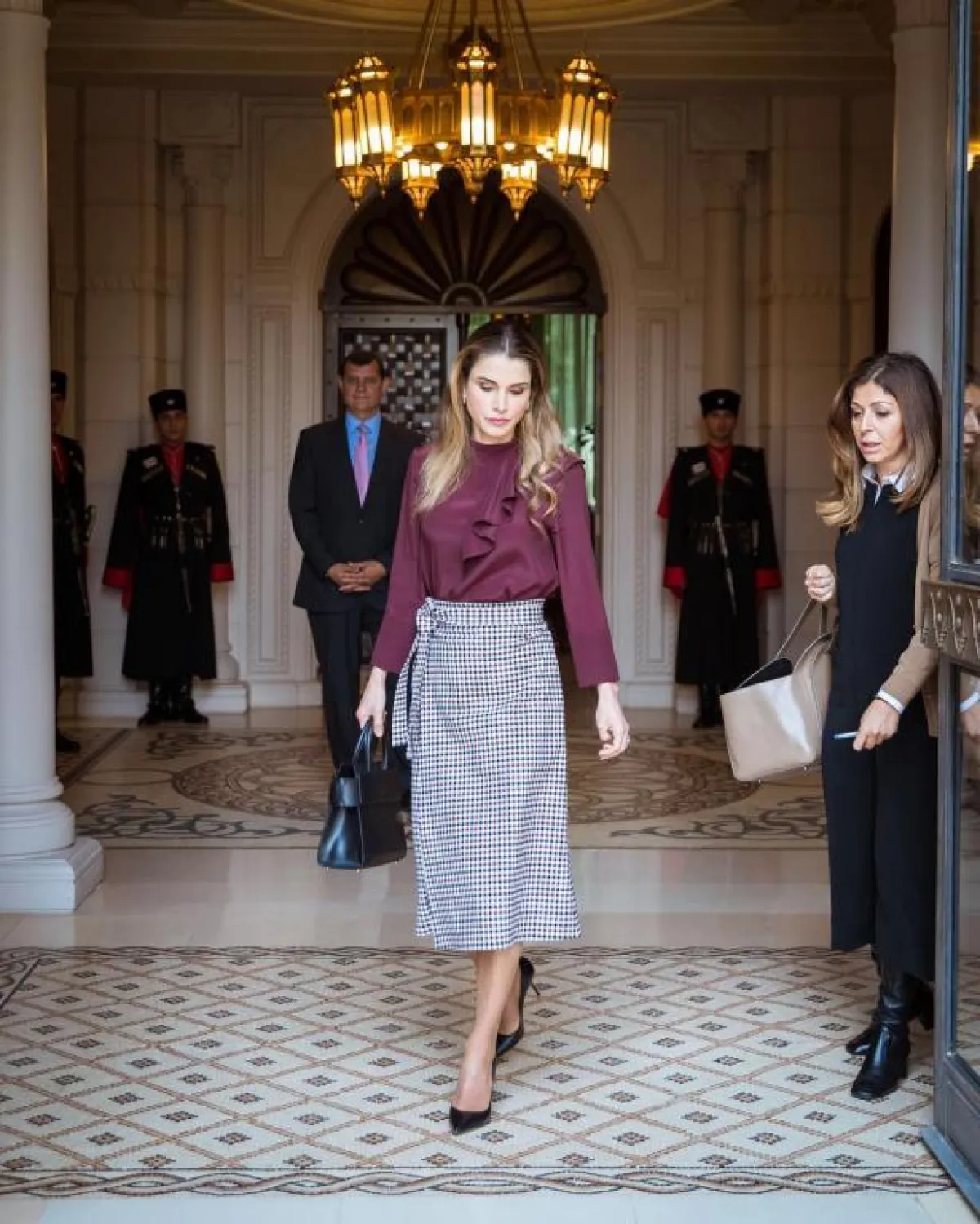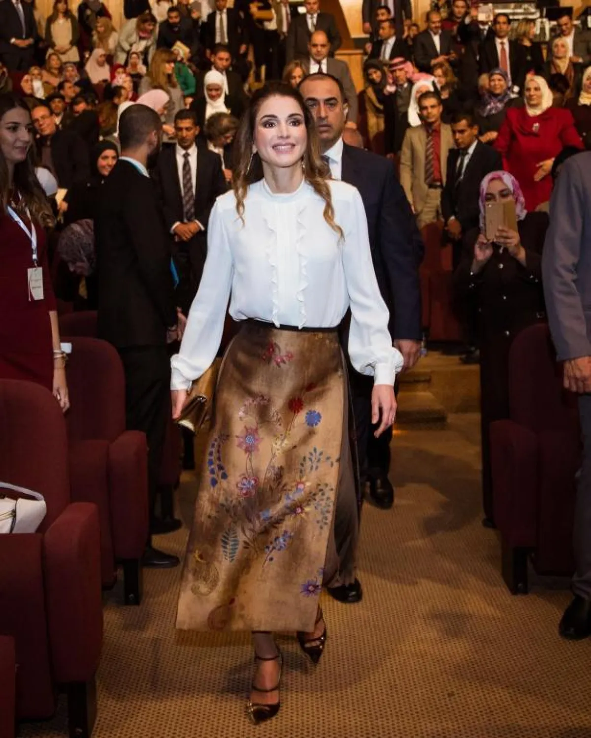 ومن خلال جولة على إطلالات الملكة رانيا، لاحظنا أنها تختار التنورة في أغلب إطلالاتها، سواء في المناسبات الرسميّة أو في الأيام العاديّة. وبالطبع لا تركّز على تصميم محدد أو لون معيّن لتنانيرها، وإنما تنوّع في خياراتها للتصاميم والألوان. فرأيناها ترتدي تنورة بتصميم بسيط باللون الأسود، مع قميص باللون الأبيض بأكمام طويلة. وفي إطلالة ثانية، نسّقت تنورة باللون البرتقالي الغامق بتصميم كشكش، مع قميص أبيض بتصميم بسيط. وتألقت بإطلالة بتنورة باللون الورديّ الفاتح بتصميم غريب ومميّز، أيضاً نسقت معها قميصاً باللون الأبيض. ورأيناها بقميص باللون الخمريّ مع تنورة طويلة، نسقت مع هذه الإطلالة حقيبة يد باللون الأسود. ولا تتردّد الملكة رانيا في انتقاء تنانير بألوان وتصاميم غريبة، فرأيناها بتنورة باللون البرونز، مزيّنة برسومات ورود اختارت معها قميصاً أبيضَ اللون، وحقيبة يد كلاتش.