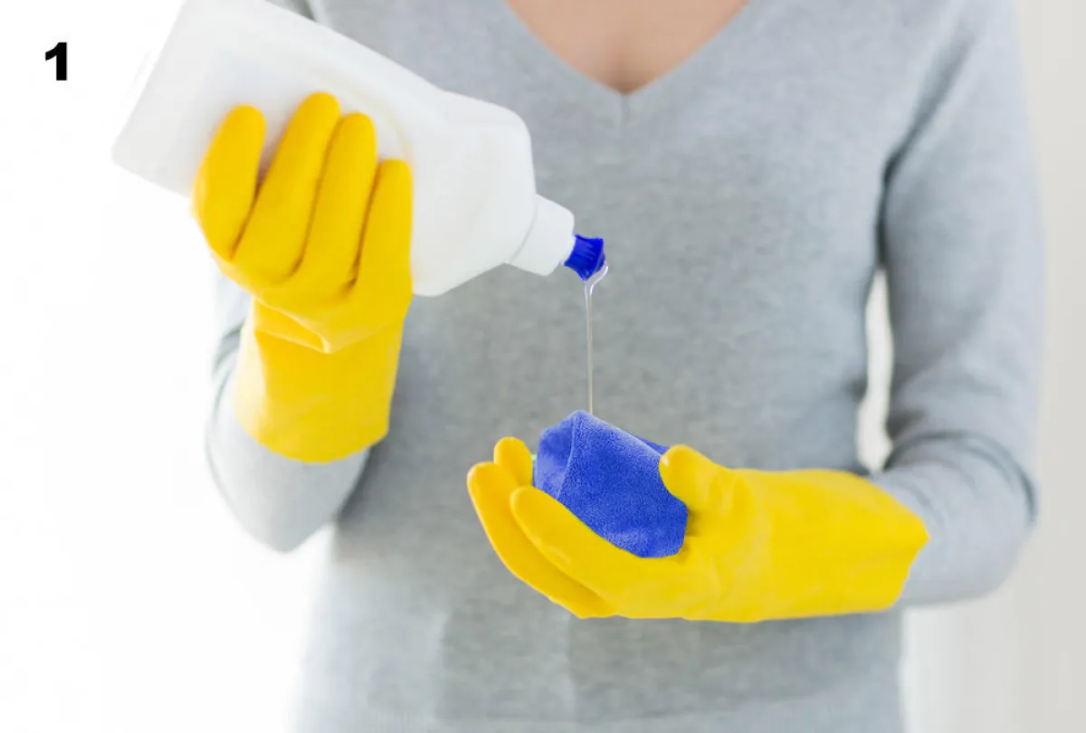1. تُبلّل قطعة من القماش بالقليل من سائل الجلي.
