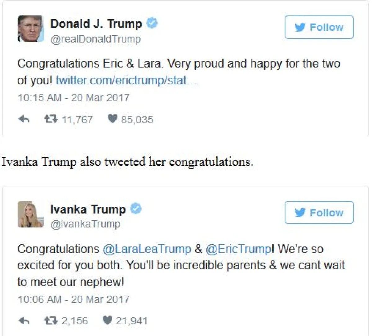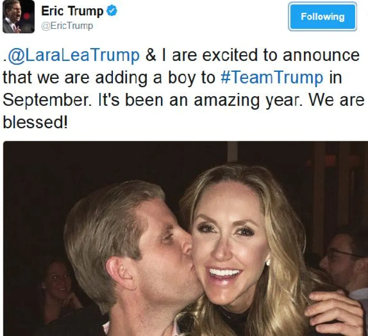 وغرد إيريك أمس الإثنين عبر حسابه على"تويتر" قائلاً: "يسعدنا أنا ولارا أن نعلن لكم أننا سنضيف صبياً إلى طاقم ترمب في سبتمبر/أيلول. فيا لها من سنة مذهلة وإنها لنعمة كبيرة!"