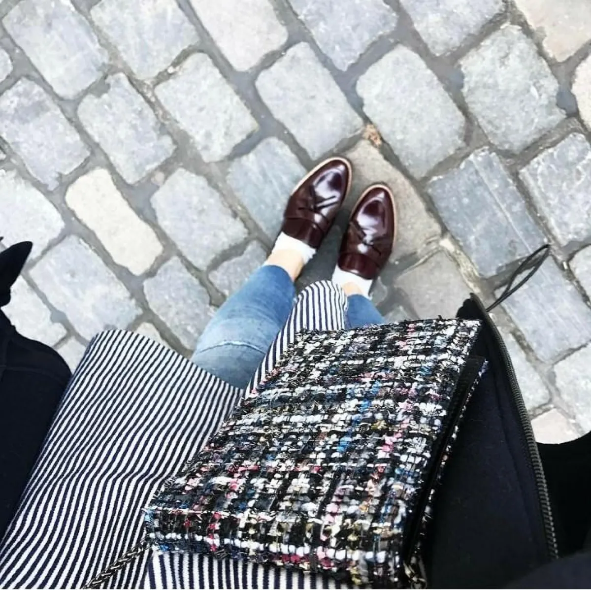 حذاء ذهبي اللون، مع إطلالة فضفاضة باللون الأسود.