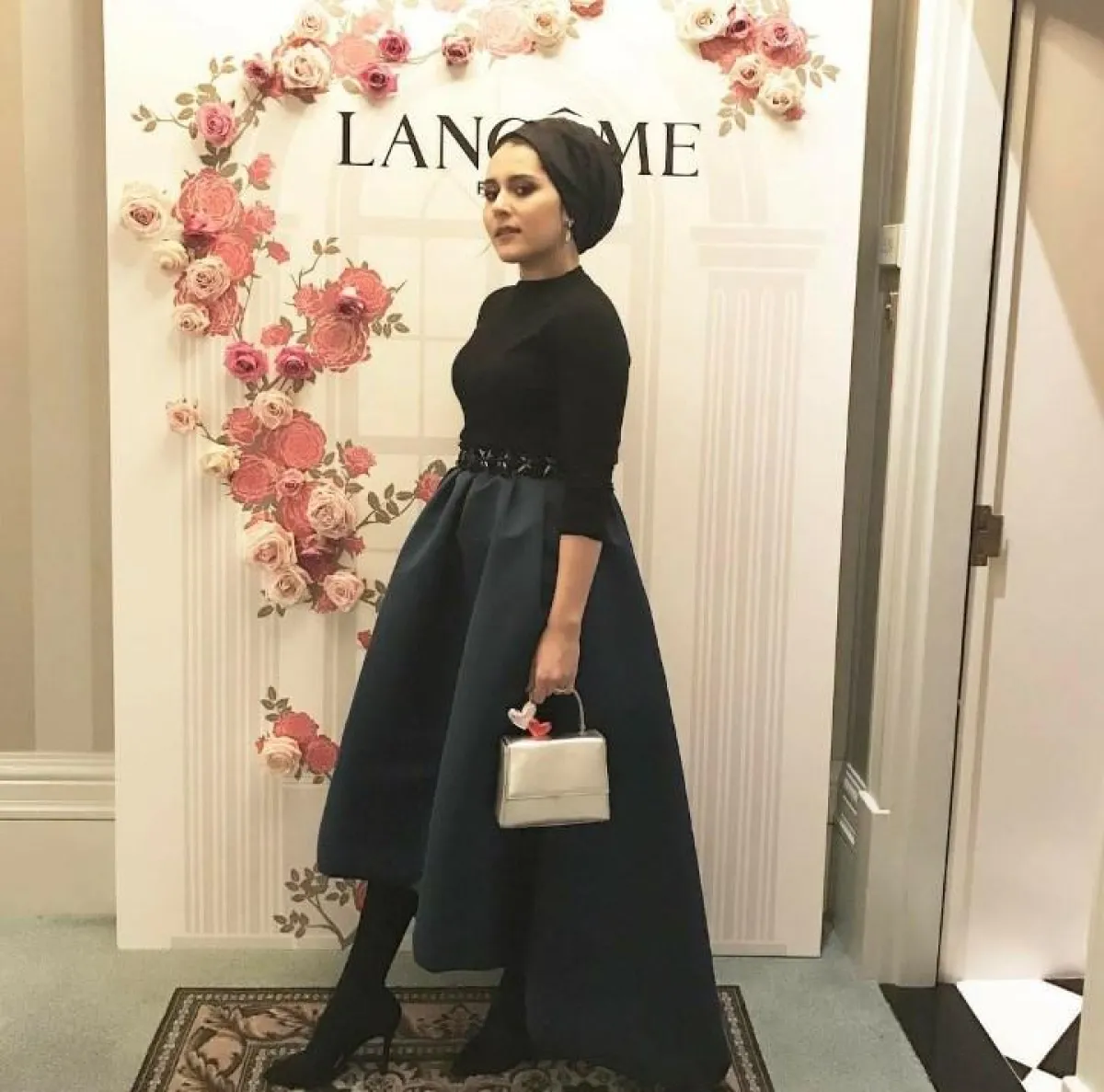أناقة واضحة بفستان أسود اللون مع ذيل.