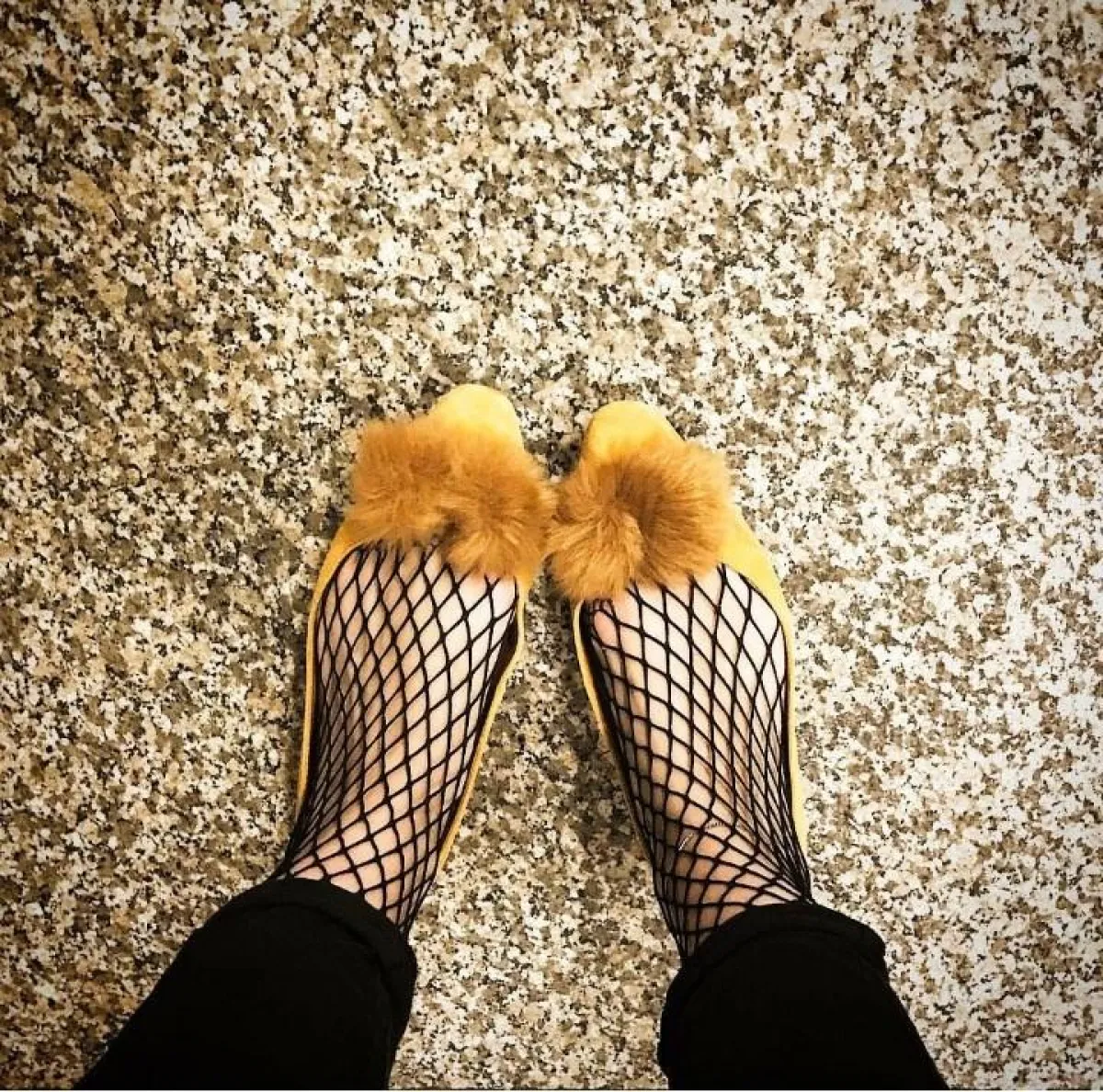 حذاء من الفرو البنّي الفاتح، مع جوارب مفرّغة.
