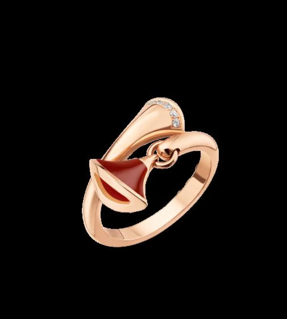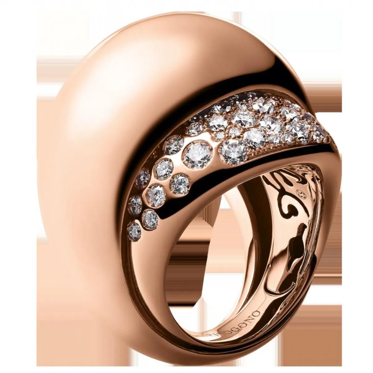 وبالطبع ليس هناك أجمل من الخواتم بين قطع المجوهرات، فهي تمنحكِ انوثة ورقيّاً. ولهذا السبب فقد قدّمت دور المجوهرات العالميّة، العديد من الخواتم المصنوعة من الذهب الوردي، كون الذهب الوردي هو المفضّل لدى السيدات، بسبب لونه الجذاب والغريب. فرأينا خاتماً من بياجيه Piaget، بتصميم قلبين متداخلين، مرصع بحبيبات من الألماس. كما قدّمت شانيل Chanel خاتماً بتصميم وردة، مميّزاً مصنوعاً من الذهب الوردي ومرصعاً بالألماس. أما بوميلاتو Pomellato، فقد قدّمت خاتماً مصنوعاً من الذهب الوردي، ومزيّناً بحبة كبيرة من حجر الأميتيسيت، ذي اللون البنفسجيّ الجذاب. بالإضافة إلى خاتم بتصميم مميز وغريب، قدّمته بولغاري Bulgari صُنع من الذهب الوردي ورُصع بالألماس، كما زُين بحجر الياقوت الأحمر. وغيرها من أهمّ دور المجوهرات العالميّة مثل: شوميه Chaumet، بوشرون Boucheron، ودي غريزوغونو De grisogono.