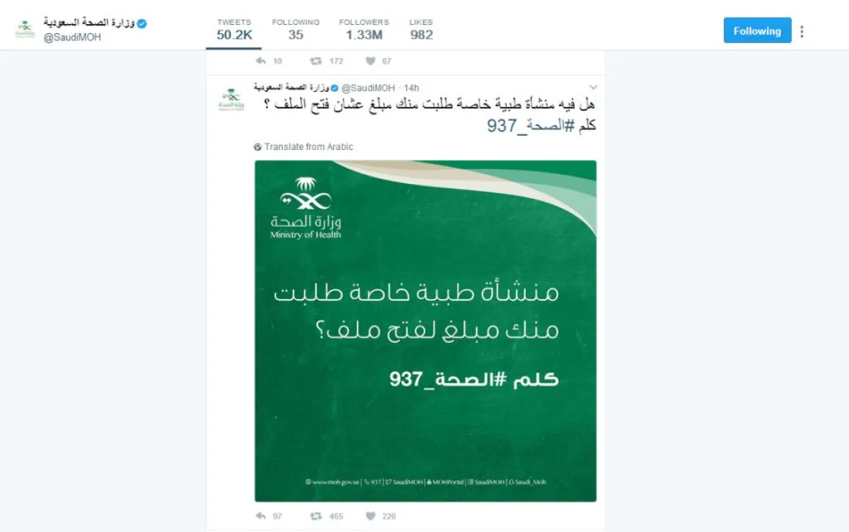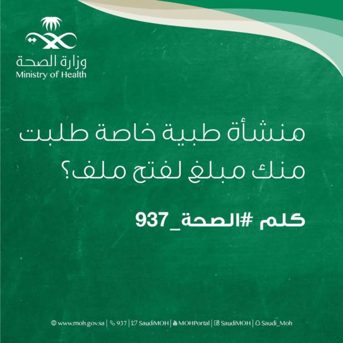 وقالت الوزارة في حسابها على "تويتر": "هل هناك منشأة طبية خاصة طلبت منك مبلغاً لفتح الملف؟ إذاً اتصل بـ #الصحة_937".