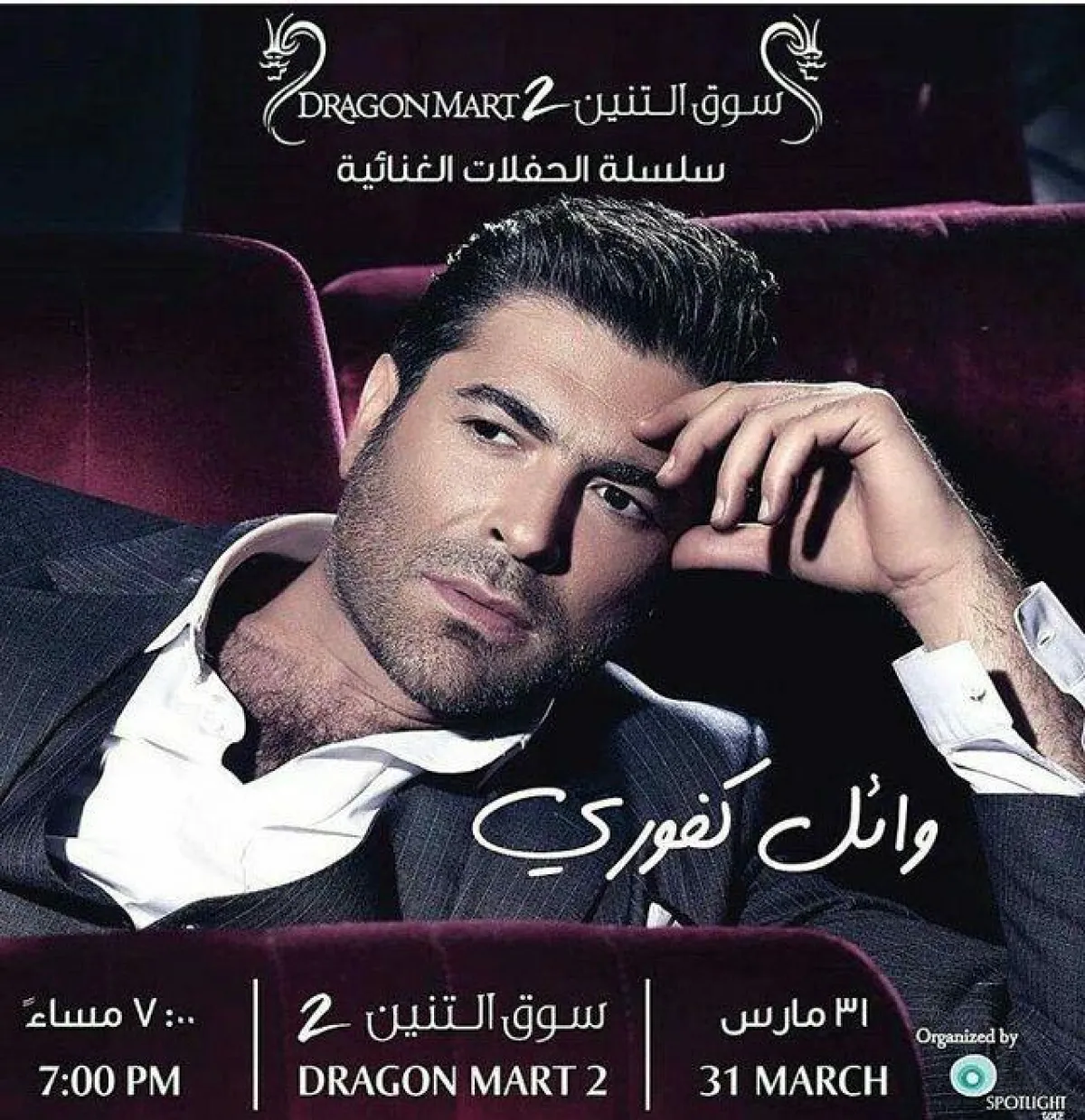 يحيي الفنان وائل كفوري حفلاً غنائياً في "سوق التنين" في دبي ، بحسب ما أعلنت صفحته الرسمية كما الصفحة الرسمية للمهرجان على موقع "فايسبوك".