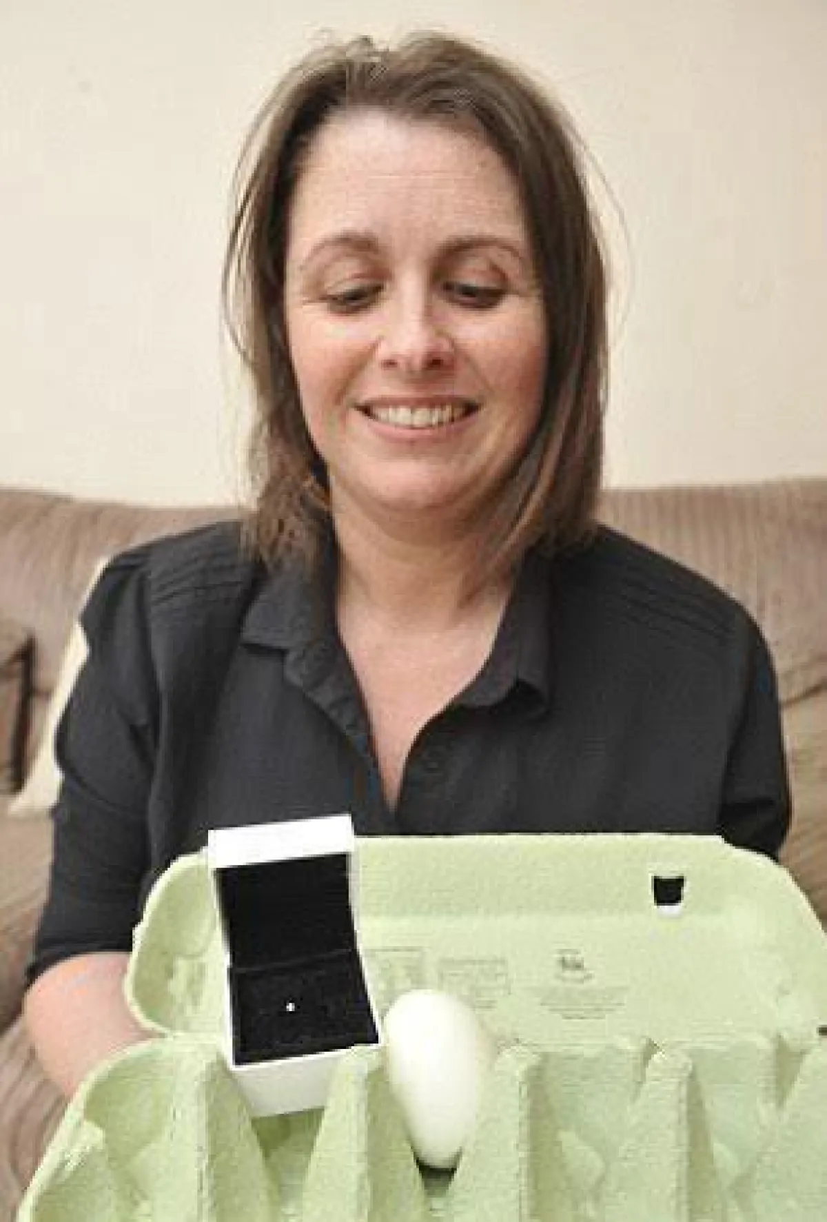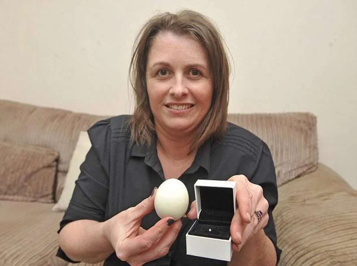 ونشرت صحيفة "ديلي ميل" البريطانية قصة سالي طومسون التي تتبع حمية خاصة لإنقاص الوزن قبل موعد زفافها من خطيبها ستيفن وارويك في سبتمبر المقبل. وقالت السيدة إنها قامت بشراء 6 بيضات وعند تناولها إحداهما صباحاً شعرت أن هناك شيئاً غريباً في فمها، واكتشفت انه ماسة صغيرة للغاية.