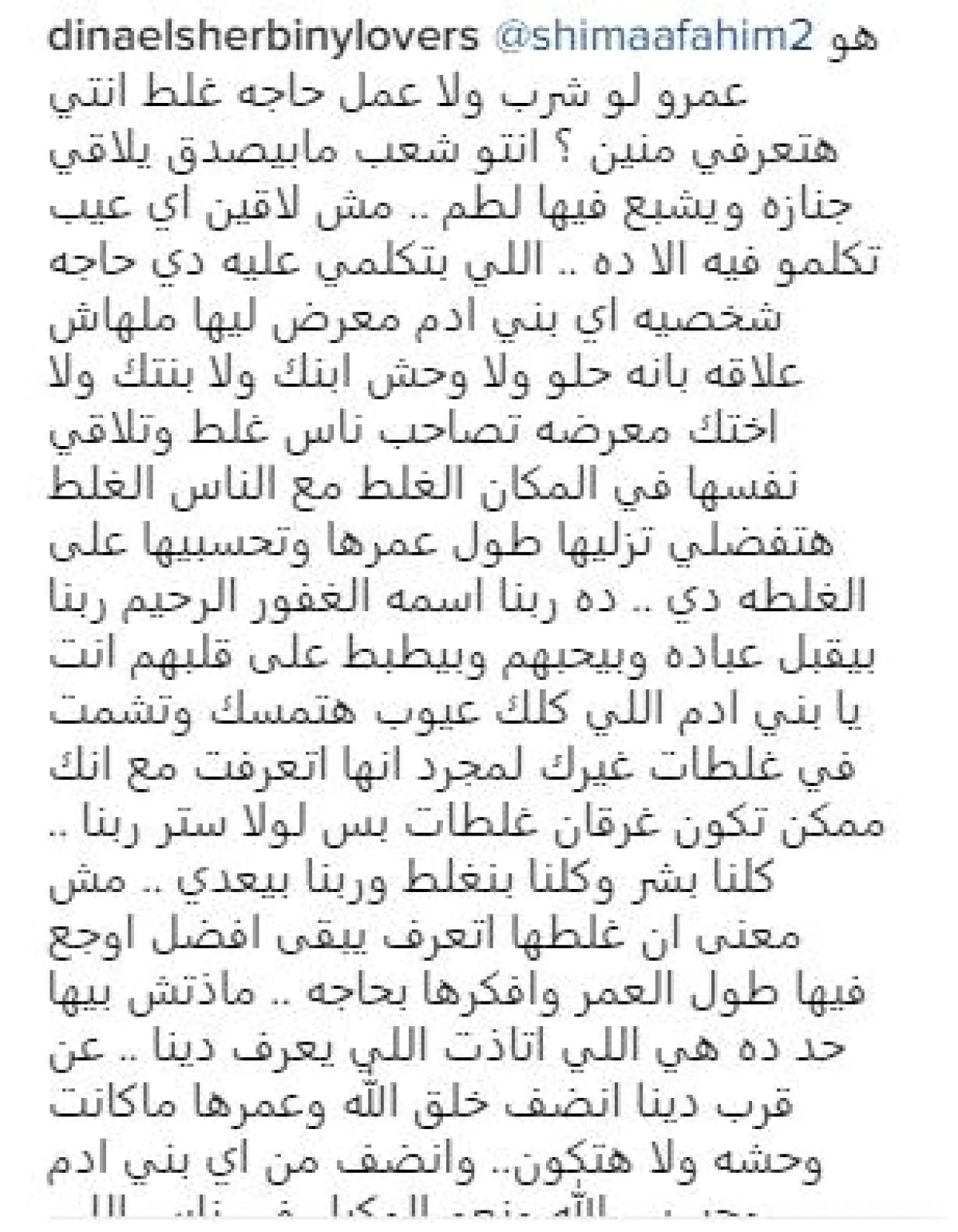 تابعت قائلة: كلنا بشر وكلنا بنغلط وربنا بيعدي .. مش معنى ان غلطها اتعرف يبقى افضل اوجع فيها طول العمر وافكرها بحاجه .. ماذتش بيها حد ده هي اللي اتاذت اللي يعرف دينا .. عن قرب دينا انضف خلق الله وعمرها ماكانت وحشه ولا هتكون.. وانضف من اي بني ادم وحسبى الله ونعم الوكيل في ناس اللي معندهاش رحمه ولا قلب مش هقول حاجه غير ربنا يحطكو في نفس الموقف ويتعمل فيكوا اللي بتعملوه في اخره وربنا هيحسبكوا على اللي بتعمله لا تعيب في اخيك فيعافيه الله ويبتليك لا تستهون في أبسط الأمور ..