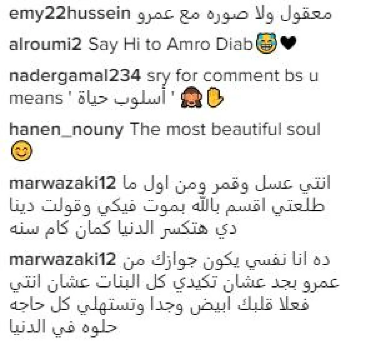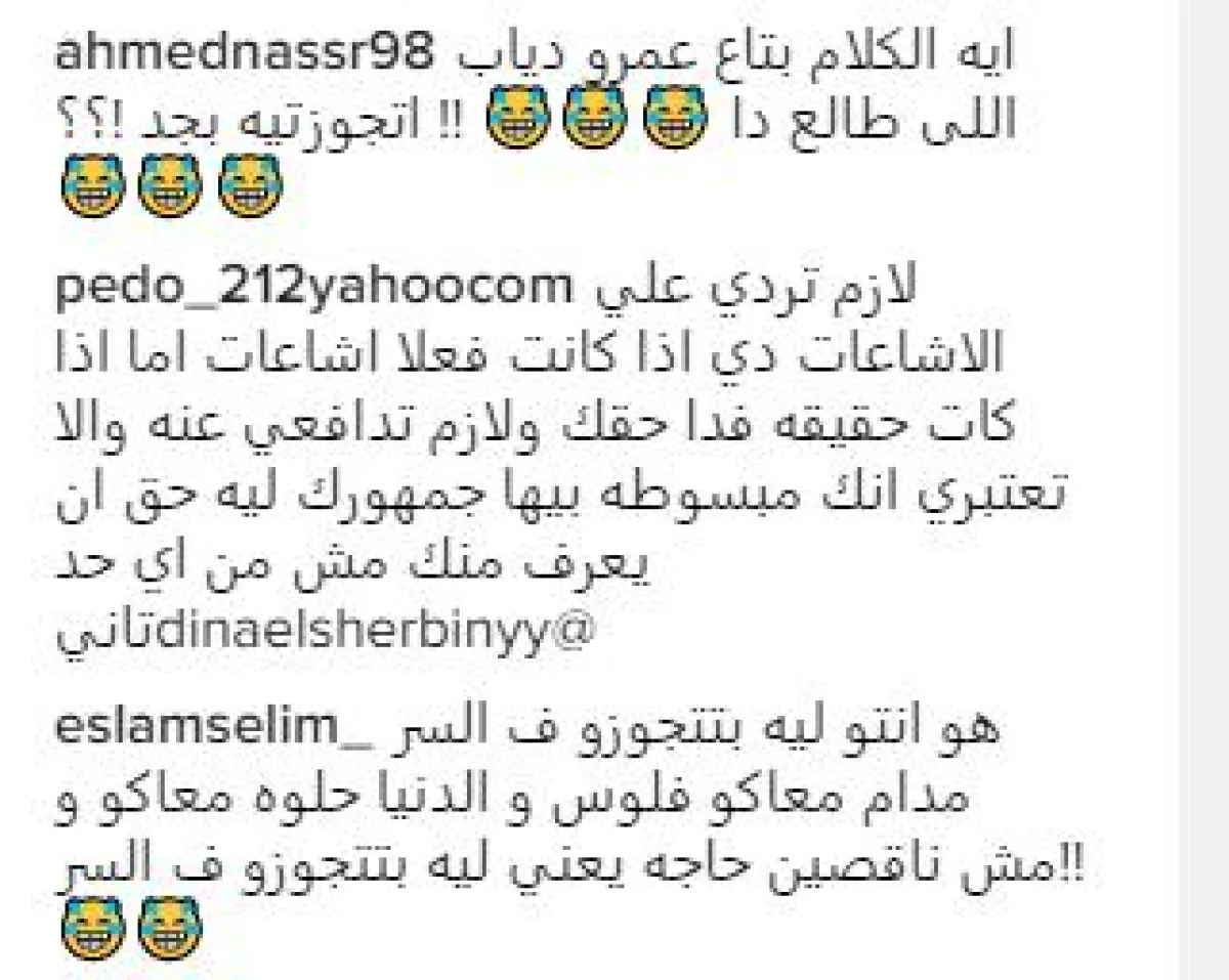 وبعد عدة تعليقات من معجبات لعمرو دياب ترفض الزيجة، علقت فتاة تدعى مروة قائلة: ده انا نفسي يكون جوازك من عمرو بجد عشان تكيدي كل البنات عشان انتي فعلا قلبك ابيض وجدا وتستهلي كل حاجه حلوه في الدنيا!!