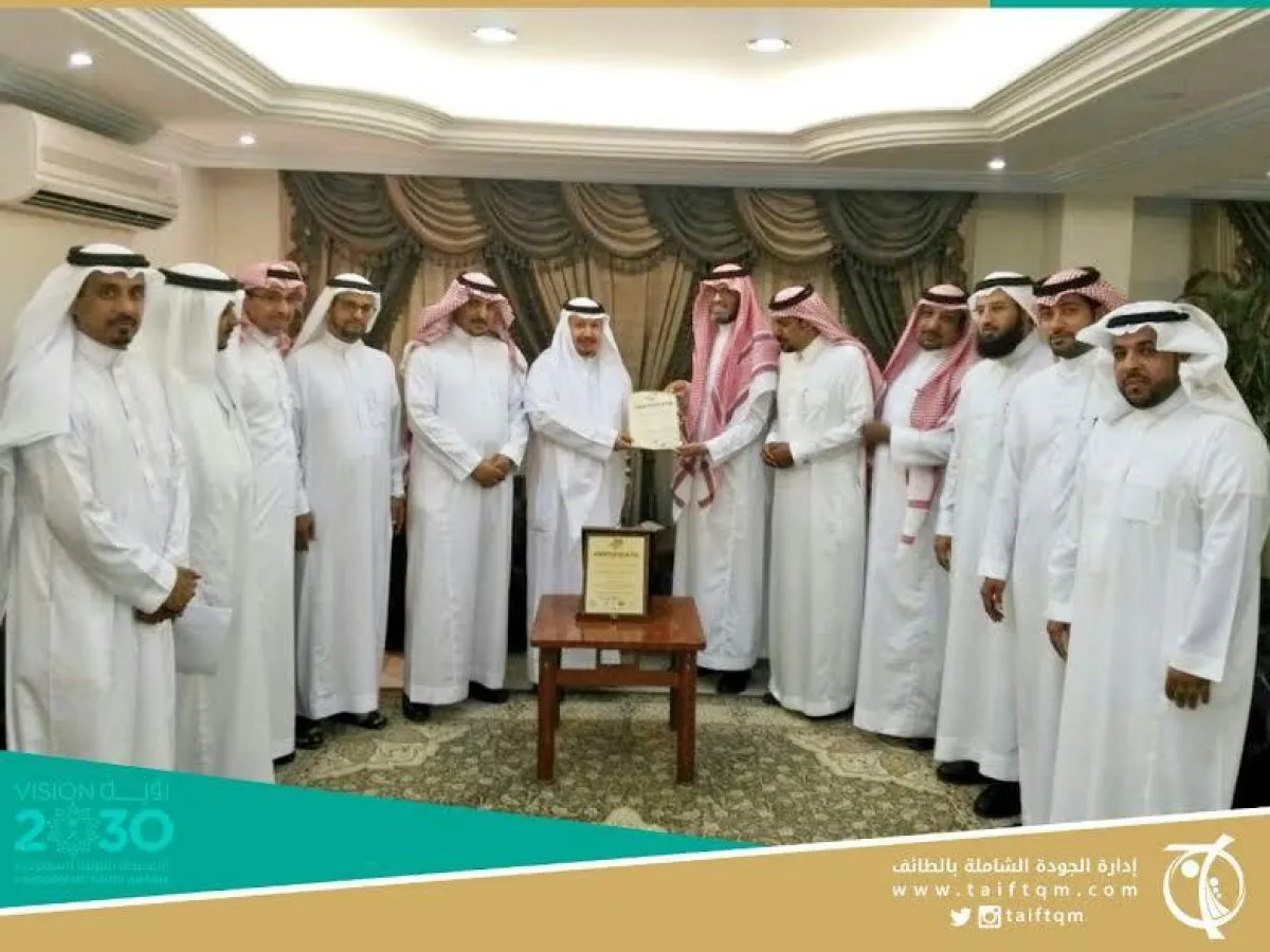 إنجاز جديد يضاف للإدارة العامة للتعليم في محافظة الطائف، وهو الحصول على شهادة "الآيزو" العالمية 9001- 2015 من شركة QS السويسرية في تطبيق نظام الجودة بالإدارة بما يحقق الأهداف المنشودة في تقديم أفضل الخدمات التعليمية، والتي تسلمها مدير عام التعليم في محافظة الطائف الدكتور محمد الشمراني، بحضور مساعده للشؤون التعليمية فهاد الذويبي وعددٍ من مديري الإدارات.