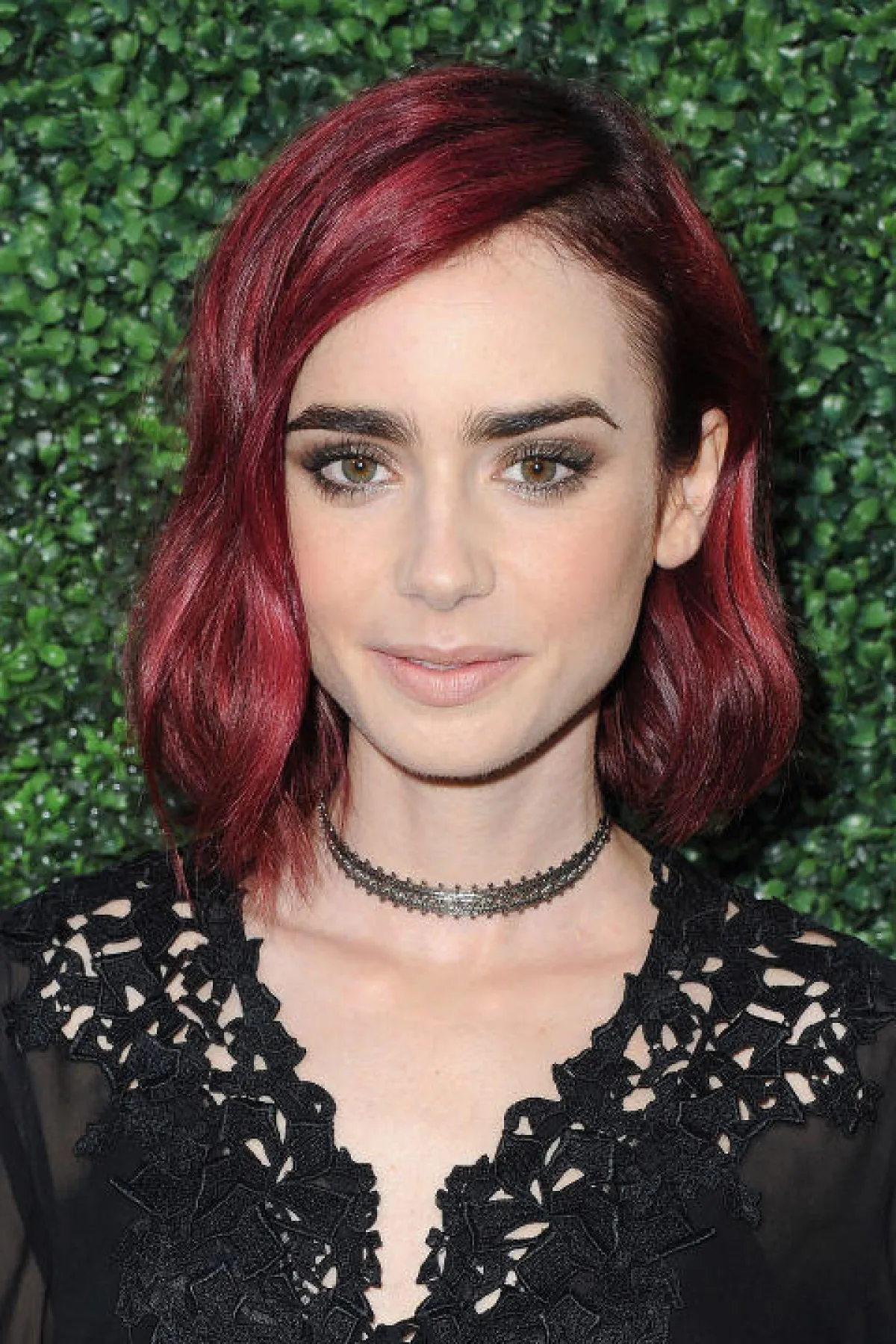 ليلي كولنز Lily Collins: خفّفت من إشراقة البورغندي بالحواجب الداكنة.