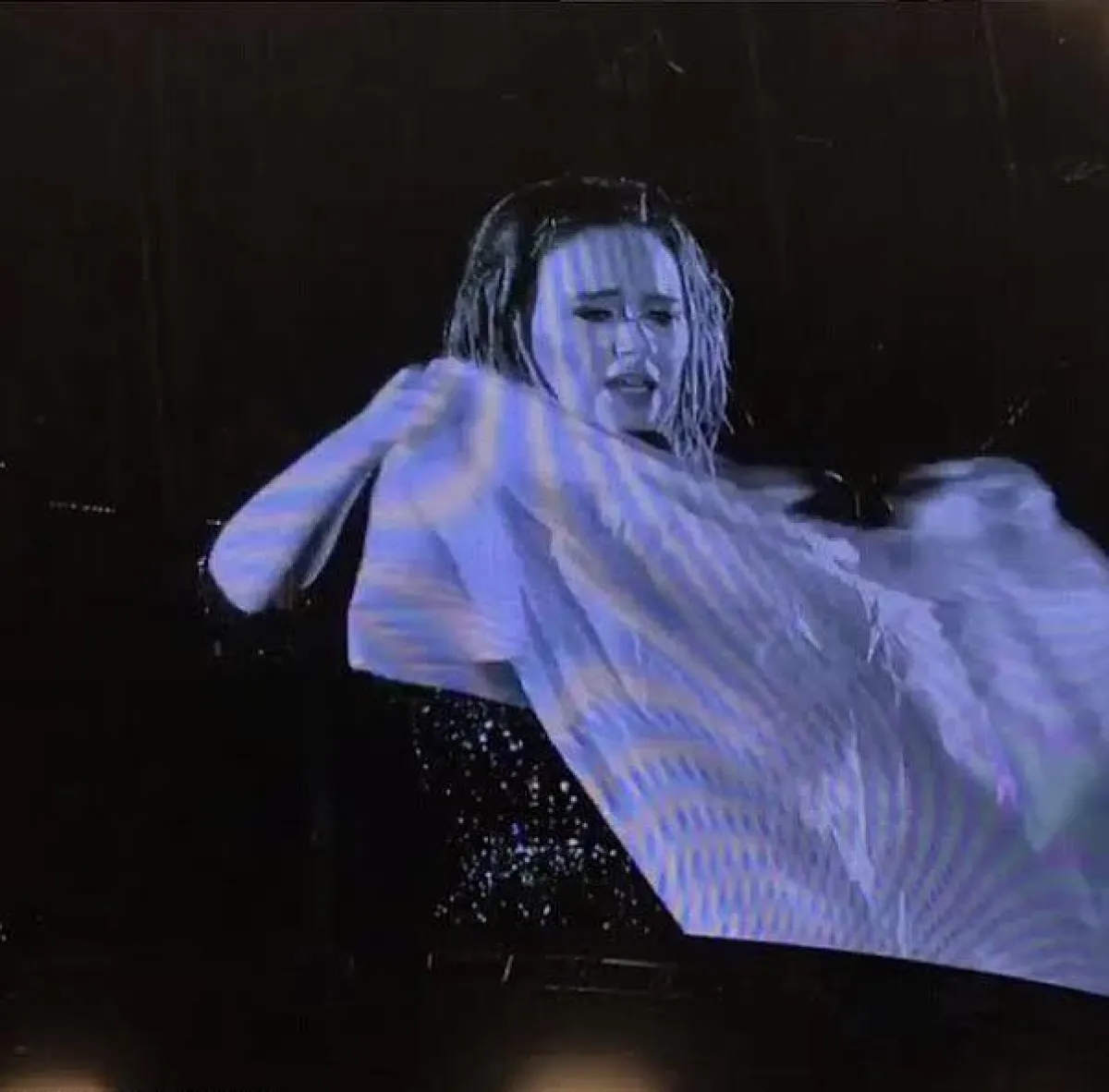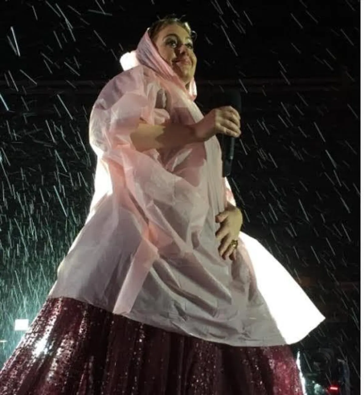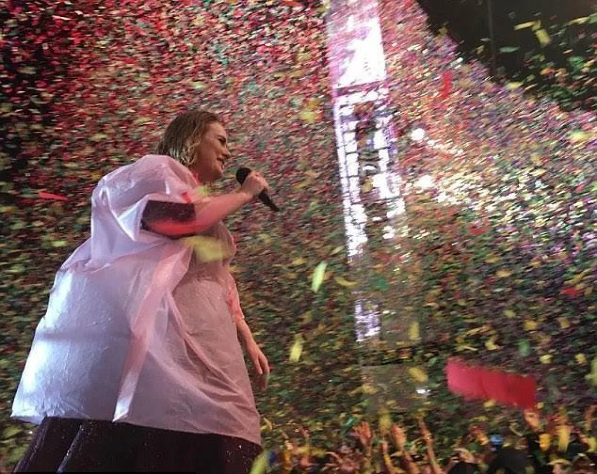 ورغم أنّها كانت ترتدي فستاناً مميّزاً، اختارت أن تضع على نفسها غلافاً من البلاستيك، ألقى به أحد الحضور على المسرح، للتخفيف قدر المستطاع من كمية المياه التي بلّلت فستانها، بينما استمرت في الغناء مبلّلة الرأس، وكذلك فعل الجمهور الذي بلغ عدده الـ 40 ألف مشاهد بـ "استاد" Mt Smart Stadium.