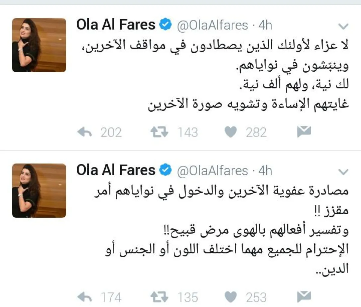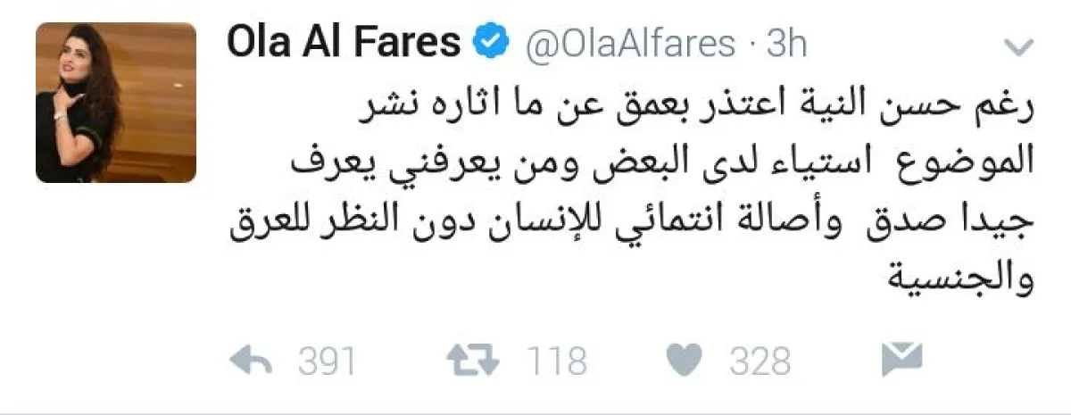 علا الفارس ردت عبر حسابها على موقع "تويتر"، أنه رغم حسن النية إلا أنها تعتذر عن نشر الموضوع، مضيفة "أن من يعرفني يعرف جيداً صدق وأصالة انتمائي للإنسان دون النظر للعرق والجنسية". كما علقت على تفسير البعض للتصرفات العفوية، قائلة: "مصادرة عفوية الآخرين والدخول في نواياهم أمر مقزز !! وتفسير أفعالهم بالهوى مرض قبيح!! الاحترام للجميع مهما اختلف اللون أو الجنس أو الدين". وتابعت في تغريداتها "لا عزاء لأولئك الذين يصطادون في مواقف الآخرين، وينبّشون في نواياهم.. لك نية، ولهم ألف نية.. غايتهم الإساءة وتشويه صورة الآخرين". .