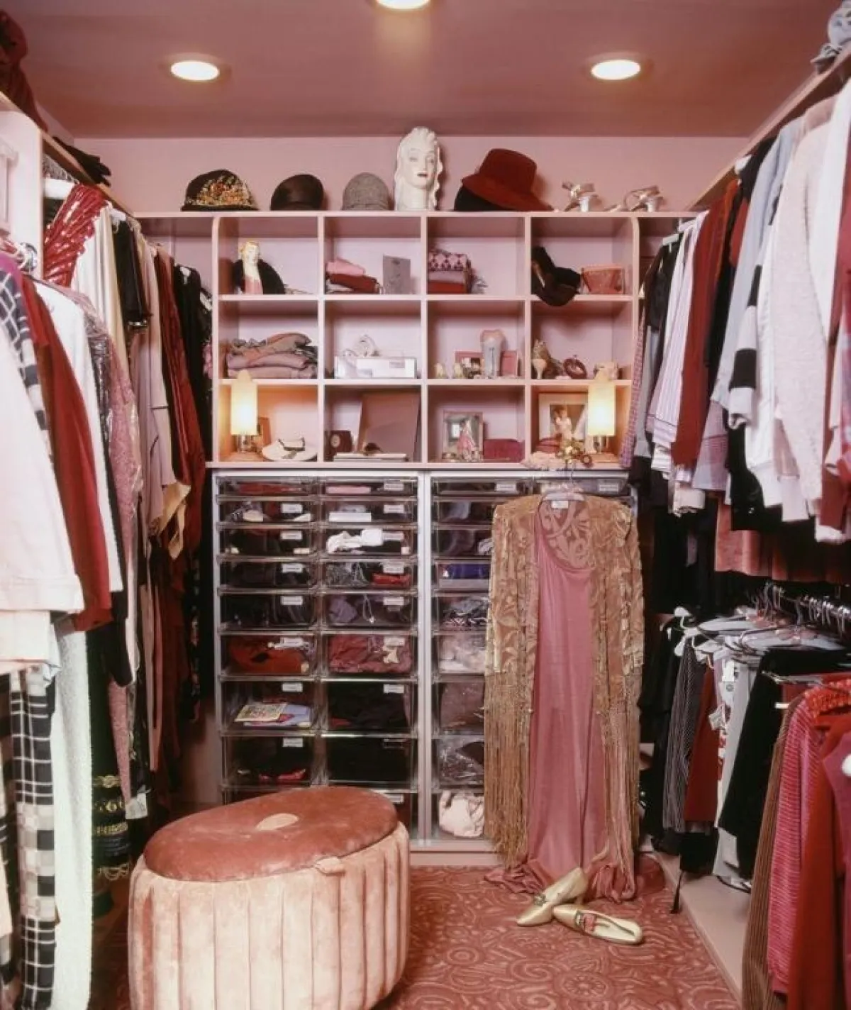 في غرفة لملابس المالكة - الممثلة، تزدحم دواخل الخزائن بأجمل الفساتين. ويتوسط المساحة، "بوف" بيضوي مكسوّ بالمخمل الزهري، وهو مخصّص لانتعال الأحذية.