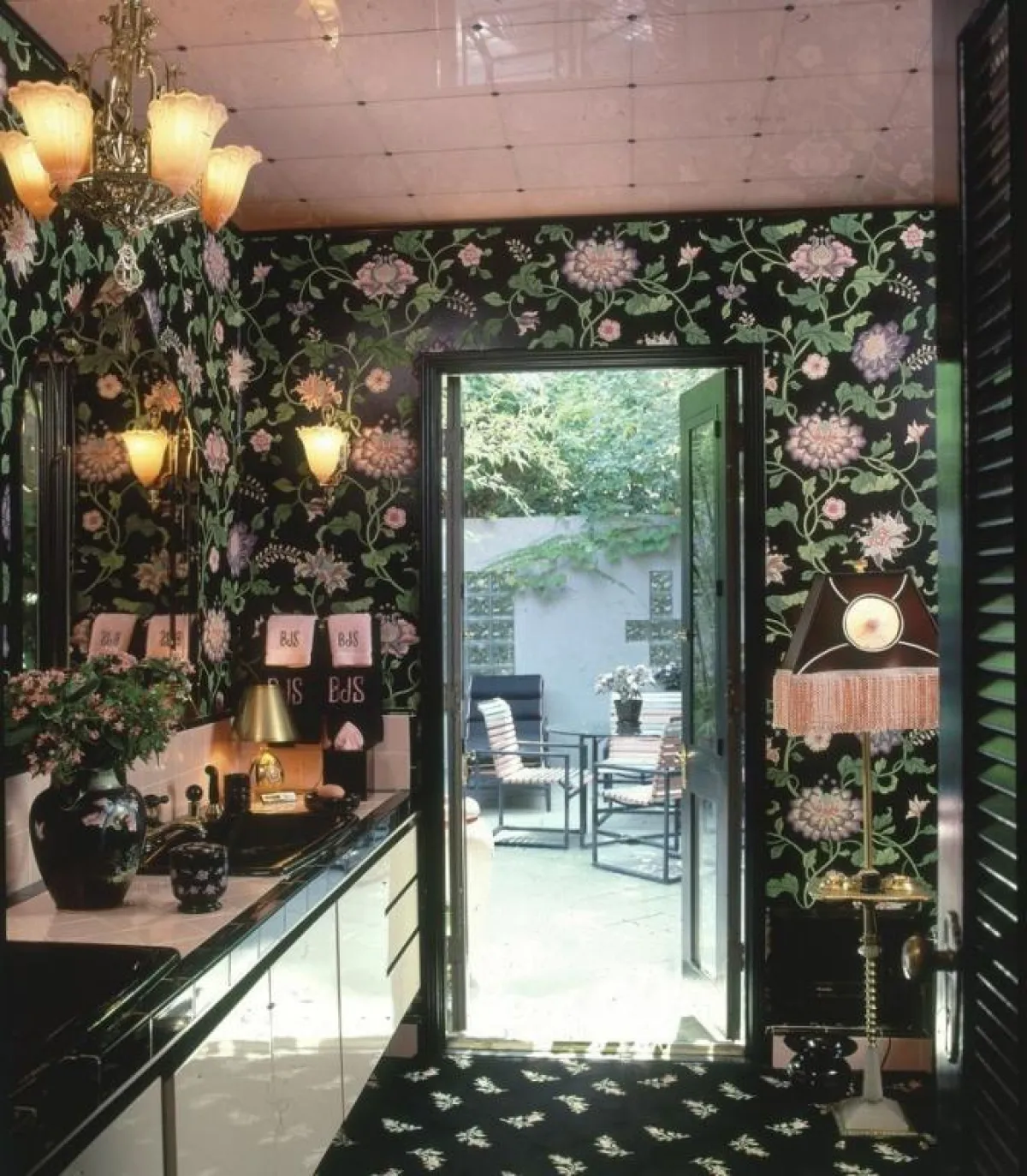 ورق جدران جذّاب يكسو الحمّام، في منزل باربرا سترايساندBarbra Streisand، بـ"ماليبو"