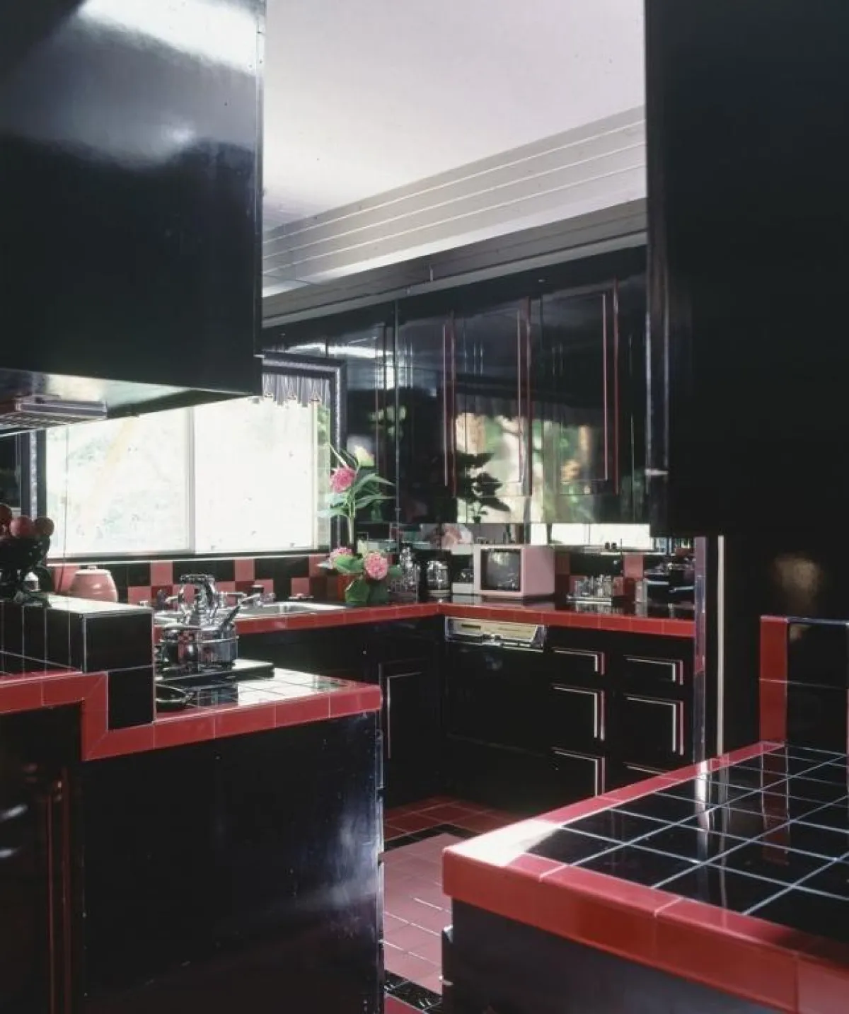 الأحمر يكسر صرامة الأسود الطاغي على مكوّنات المطبخ، في منزل باربرا سترايساند Barbra Streisand، بـ"ماليبو"