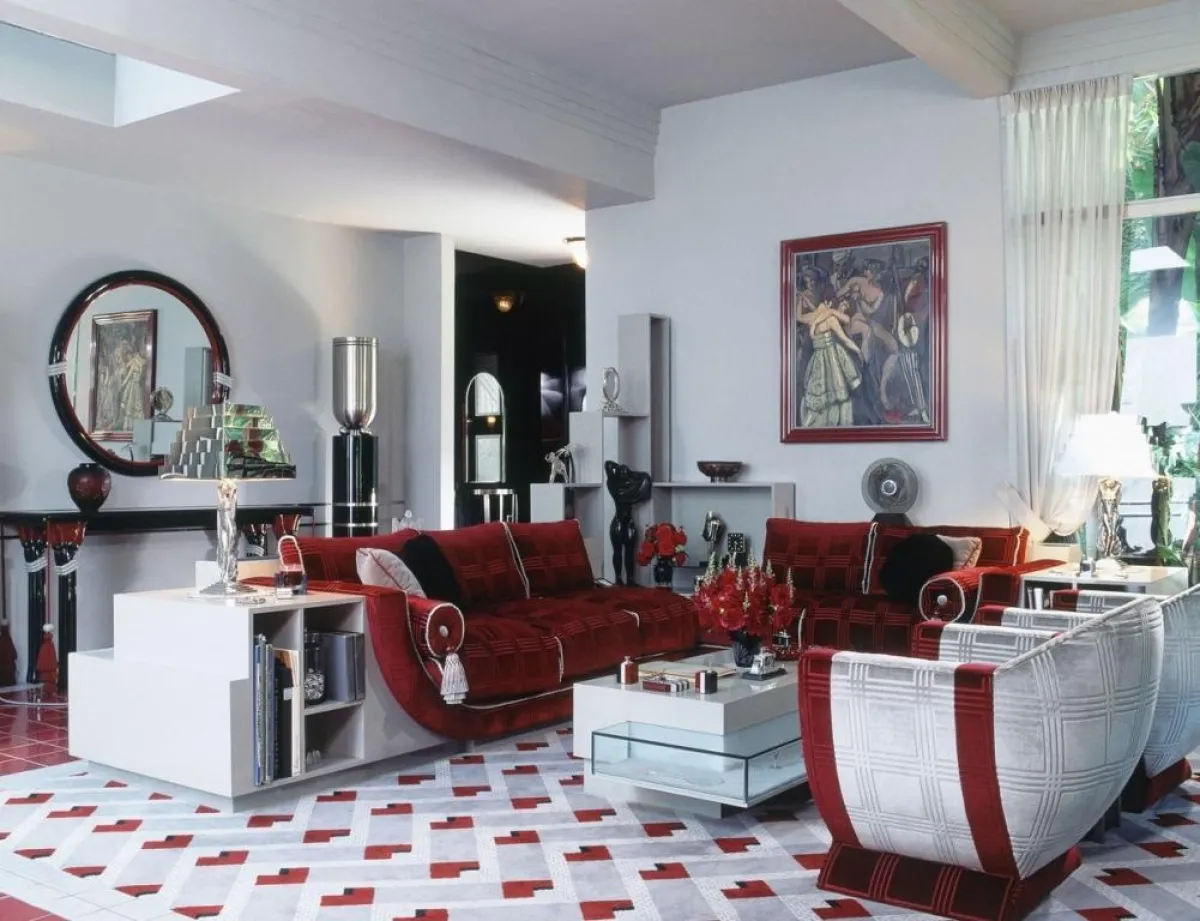 في منزل باربرا سترايساند Barbra Streisand الواقع في "ماليبو"، إحدى مدن مقاطعة "لوس أنجلس" بولاية كاليفورنيا، تتلوّن أساسيّات الصالون بالأبيض، فيما يحلّ الأحمر على أقمشة الأرائك و"الاكسسوارات"، كما يشارك في تصميم البلاط.