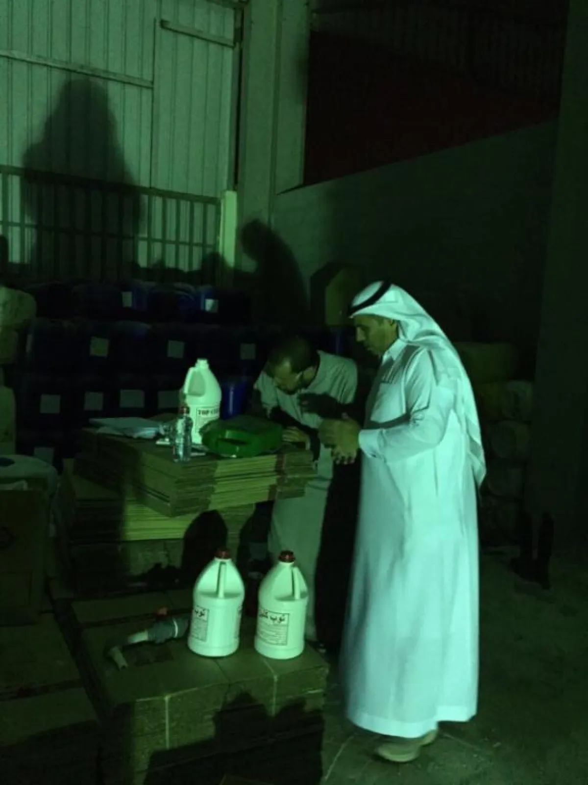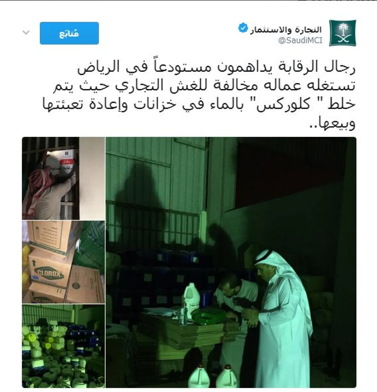 قام رجال الرقابة في وزارة التجارة والاستثمار بمداهمة مستودع في الرياض، تستغله عمالة مخالفة للغش التجاري، حيث يتم خلط "الكلوركس" بالماء في خزانات، وإعادة تعبئتها وبيعها.