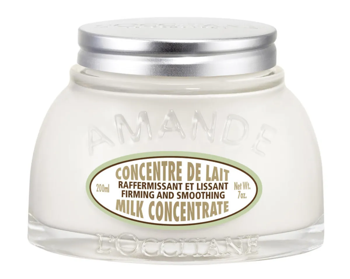 حليب اللوز المركّز– 200 مل: يقوم كريم الجسم المعزّز جدّاً لتماسك البشرة والغني بزيت وحليب اللوز، بتغذية البشرة وتنعيمها. فمزيج السيليسيوم وبروتينات اللوز، الشبيهة بالكولاجين، يكافح بفعاليّة ترهّل البشرة عبر ترميم النسيج الداعم لها. ويتغلغل هذا القوام الخفيف والكريمي في البشرة بدون ترك أيّ أثر دهني. تصبح البشرة بنعومة الحرير مع رائحة منعشة ورقيقة.