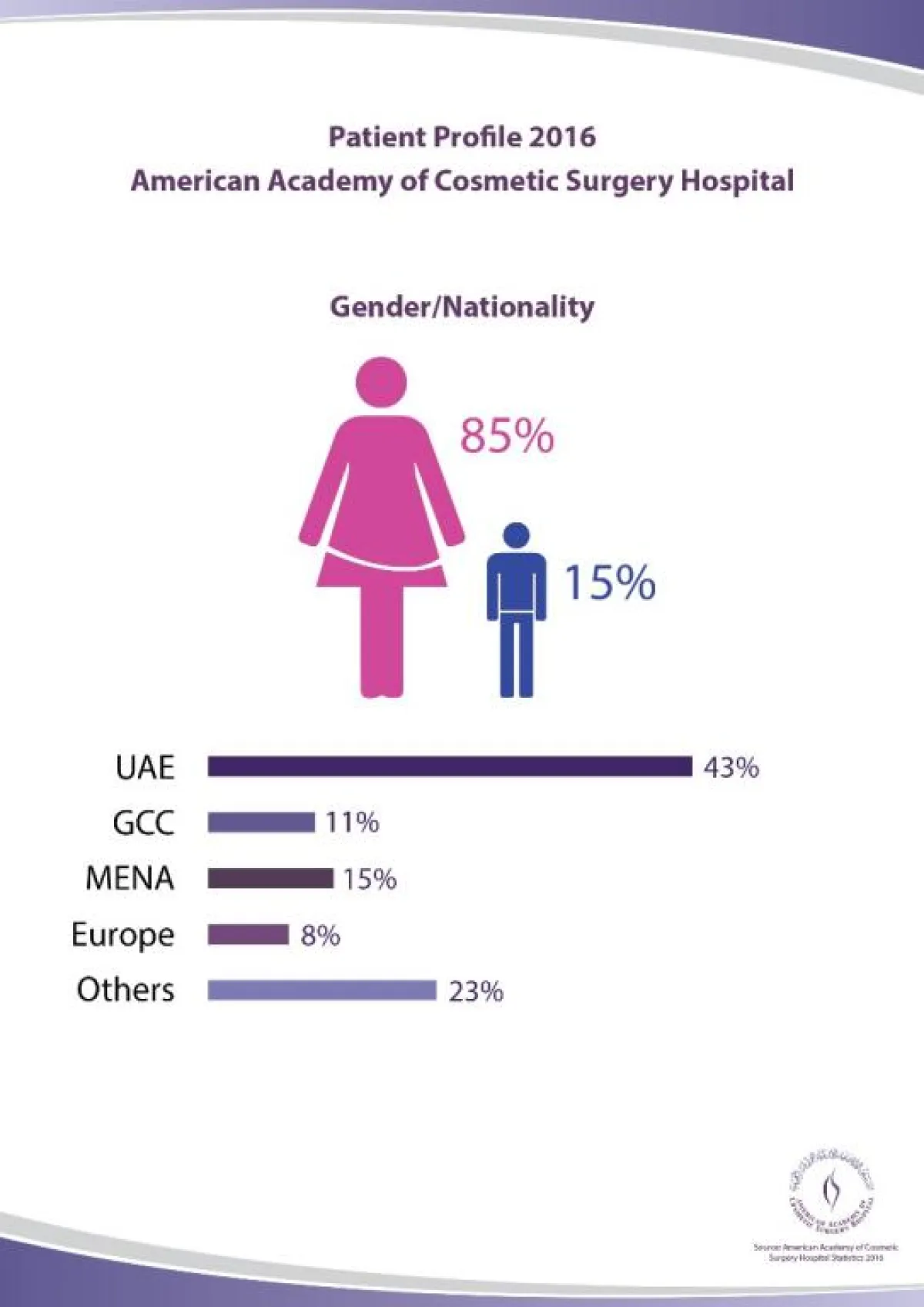 استقبل مستشفى الأكاديميّة الأمريكيّة للجراحة التجميليّة في عام 2016، زواراً من أكثر من 100 جنسيّة لتلقّي العلاج. غالبيتهم من مواطني دولة الإمارات (44٪)، وهي نسبة شبيهة بالعام السابق 2015.
