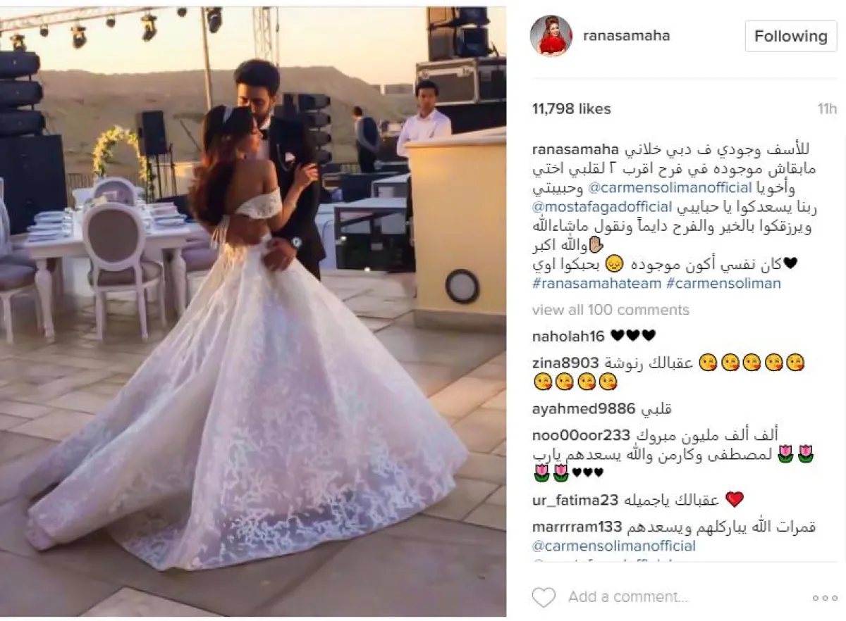 رنا تلقت عدة استفسارات من جمهورها ومن عشاق كارمن سليمان عن غيابها خاصة وأنها لم تشارك بحفل الخطوبة أو مراسم عقد القران، وسرت شائعات تؤكد أن غيابها متعمد، وطالبها جمهورها بالذهاب للحفل باسرع وقت، وردت عبر حسابها الشخصي بموقع إنستقرام، بنشر صورة للعروسين وعلقت عليها قائلة: "للأسف وجودي في دبي خلاني مابقاش موجوده في فرح اقرب ٢ لقلبي اختي وحبيبتي كارمن سليمان وأخويا مصطفى جاد، ربنا يسعدكوا يا حبايبي ويرزقكوا بالخير والفرح دايماً ونقول ماشاءالله والله اكبر، كان نفسي أكون موجوده بحبكوا اوي".