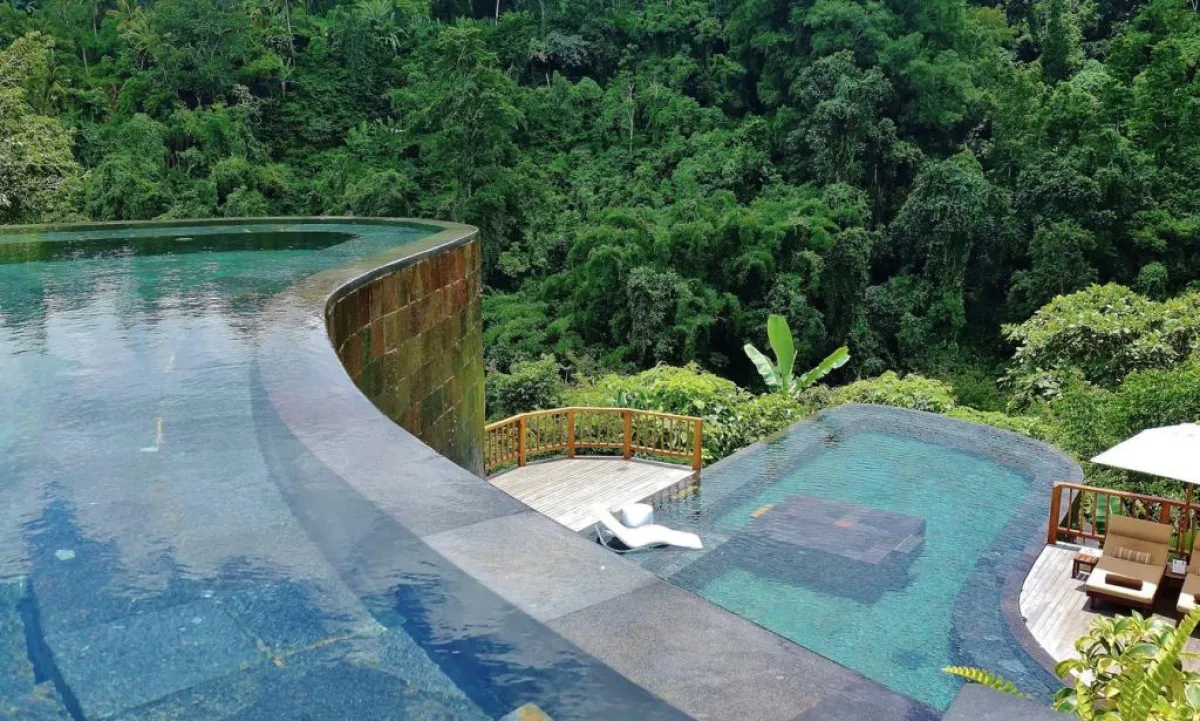 يحوي المنتجع الأندونيسي ثلاث وثمانين فيللا، فضلًا عن حوض سباحة يقع على منحدر وتحوطه الغابات المطيرة. ويطلّ حوض السباحة على نهر "أيونغ"، مع تصميمٍ مستوحى من حقول الأرز الشهيرة في "أوبود".