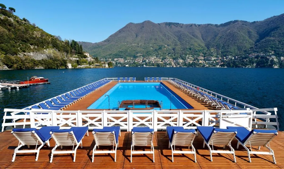يحتلّ الفندق موقعًا مثاليًّا على بحيرة "كومو" الرومانسية، ويحوي بركة سباحة عائمة ذات إطلالات خلّابة على البحيرة والجبال التي ترتفع 28 ميلًا من حافة المياه.