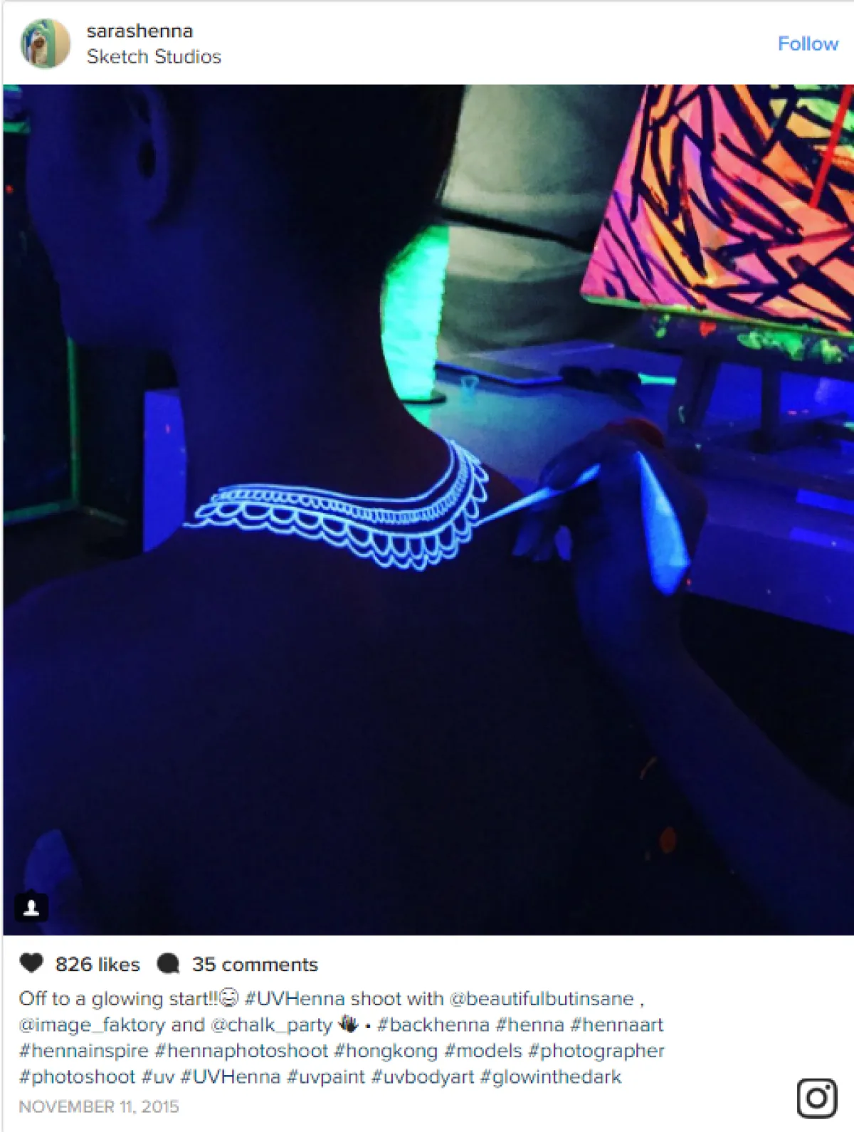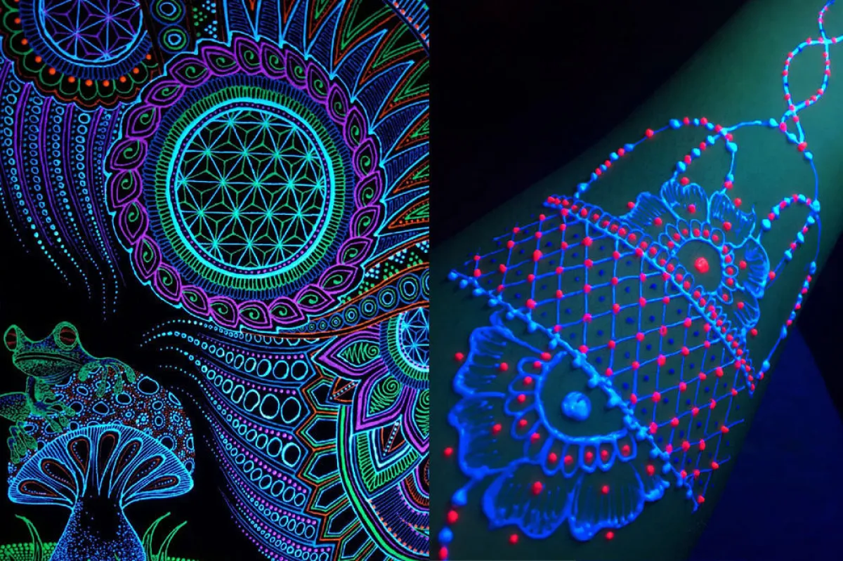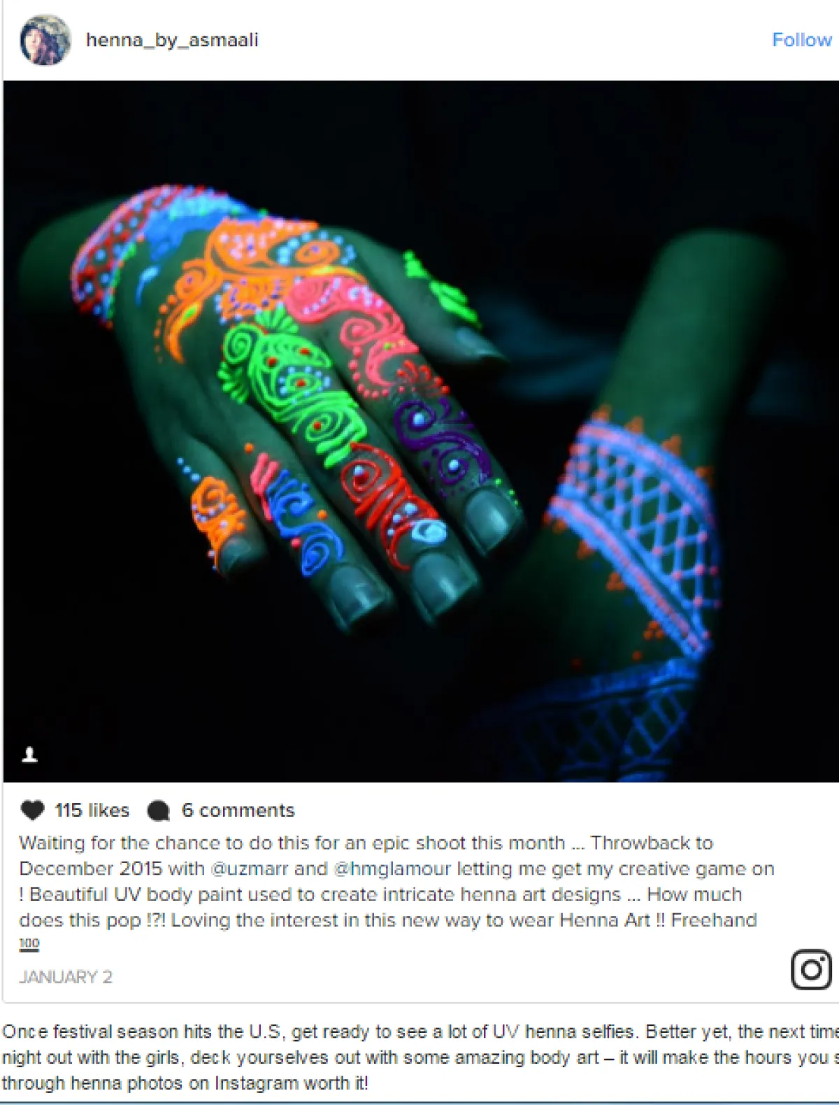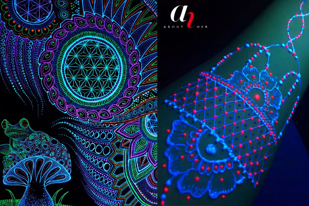 عندما يبدأ موسم المهرجانات في الولايات المتحدة، استعدي لرؤية صور السيلفي المليئة بتصاميم الحنّاء فوق البنفسجيّة، والأفضل من ذلك، عندما تخرجين لسهرة مع صديقاتك، اعتمدنَ تزيين أجسامكنّ بهذا الفنّ الرائع، واستمتعنَ بالنظر لصوركنّ على انستقرام.